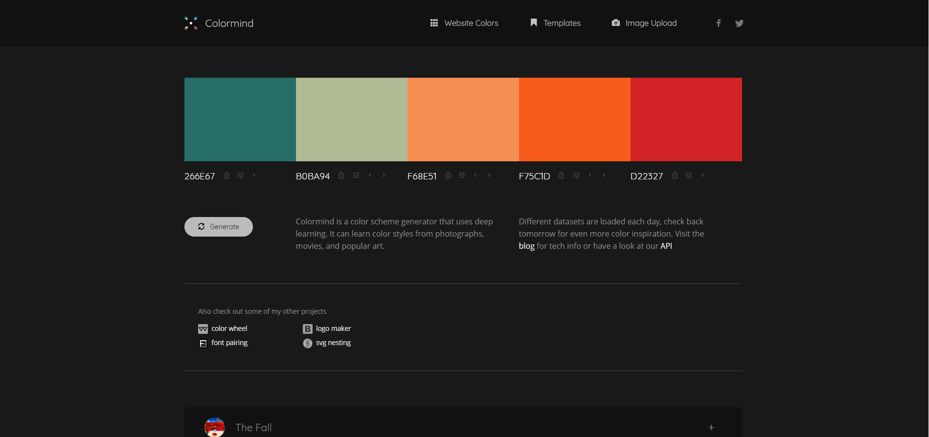 Colormind — продвинутый сервис для создания цветовой схемы для сайта. Онлайн-инструмент не только генерирует палитру, но и позволяет очень тонко настраивать каждый из оттенков, а также составляет подборку цветов на основе загруженного изображения.