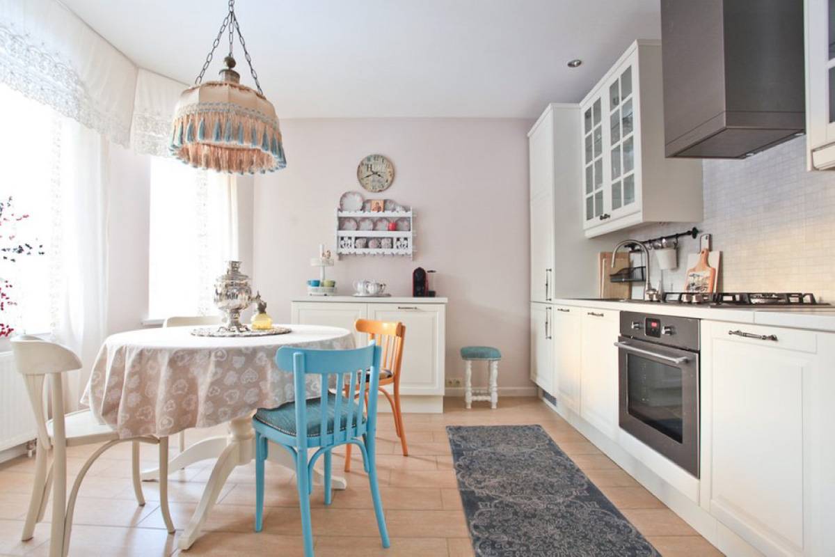Тут во внимание нужно брать отделку стен, потолка, пола, выбранную мебель. Основным критерием отбора вышеперечисленных параметров будет цветовая гамма. В этом вопросе специалисты чаще всего приходят к такому решению: если стены выполнены в ярких, вызывающих тонах, то кухонная мебель должна быть исполнена в спокойно-постельных красках