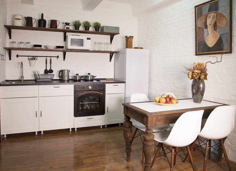 Тем не менее, не всегда на кухне маленького размера можно поставить что-то не считая гарнитура и маленького кухонного стола. В данном варианте вас спасать стены! Применить их можно по разному — не только для того, чтобы установить навесные шкафчики.