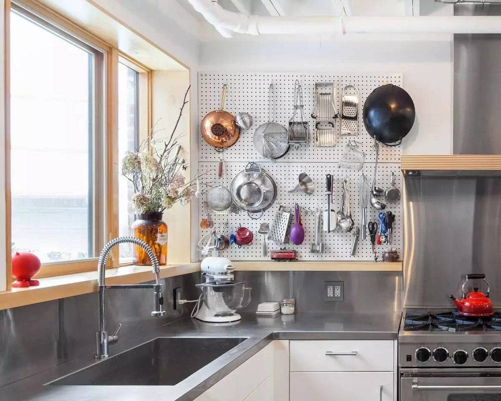 Удобная фишка для хранения кухонных девайсов — перфорированная панель на стенку. На нее легко подвешивать любой инвентарь кухни — от поварешек до маленьких сковородок.