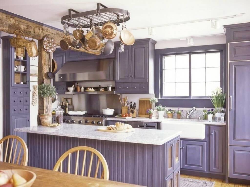Современная фиолетовая кухня в деревянном доме в стиле прованс с вытяжкой из нержавейки, встроенным холодильником и медными кастрюлями над островом в качестве декора.