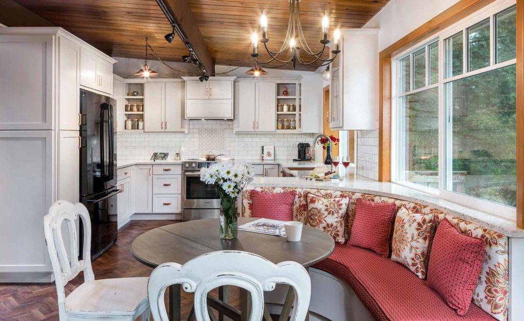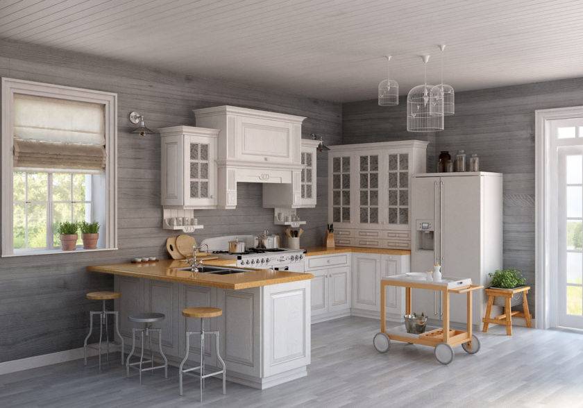 Этот стиль одинаково хорошо подходит для оформления как небольших кухонь в квартирах, так и просторных помещений загородных домов. Поскольку он предполагает использование светлых тонов, с его помощью можно визуально расширить комнату.