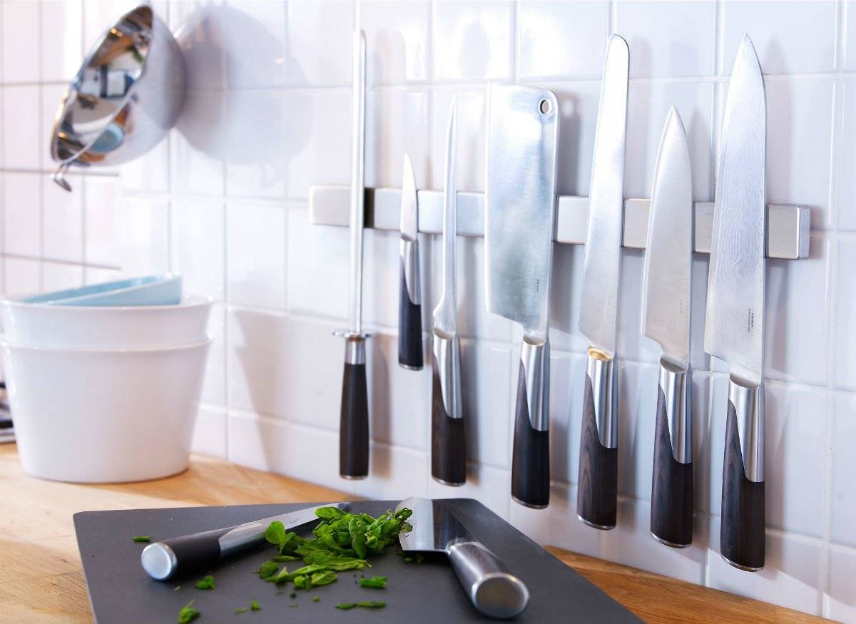 Один из самых распространенных способов хранения ножей – размещение магнитной полосы на стене. Он подходит для небольших кухонь, так как не занимает места на рабочих поверхностях и в шкафах. Если вас не устраивает металлический дизайн, то существует альтернатива – деревянная панель со встроенными небольшими магнитами отдельно для каждого инструмента. Выглядит стильно.