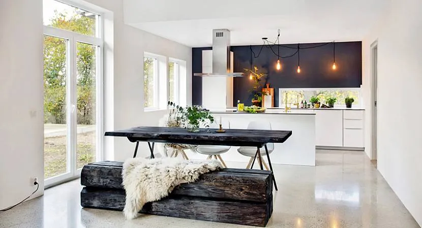 В большой комнате найдется место для просторного обеденного стола – традиционного скандинавского элемента дизайна. Он разделяет помещение сразу на 3 части – кухню, столовую и зону отдыха.
