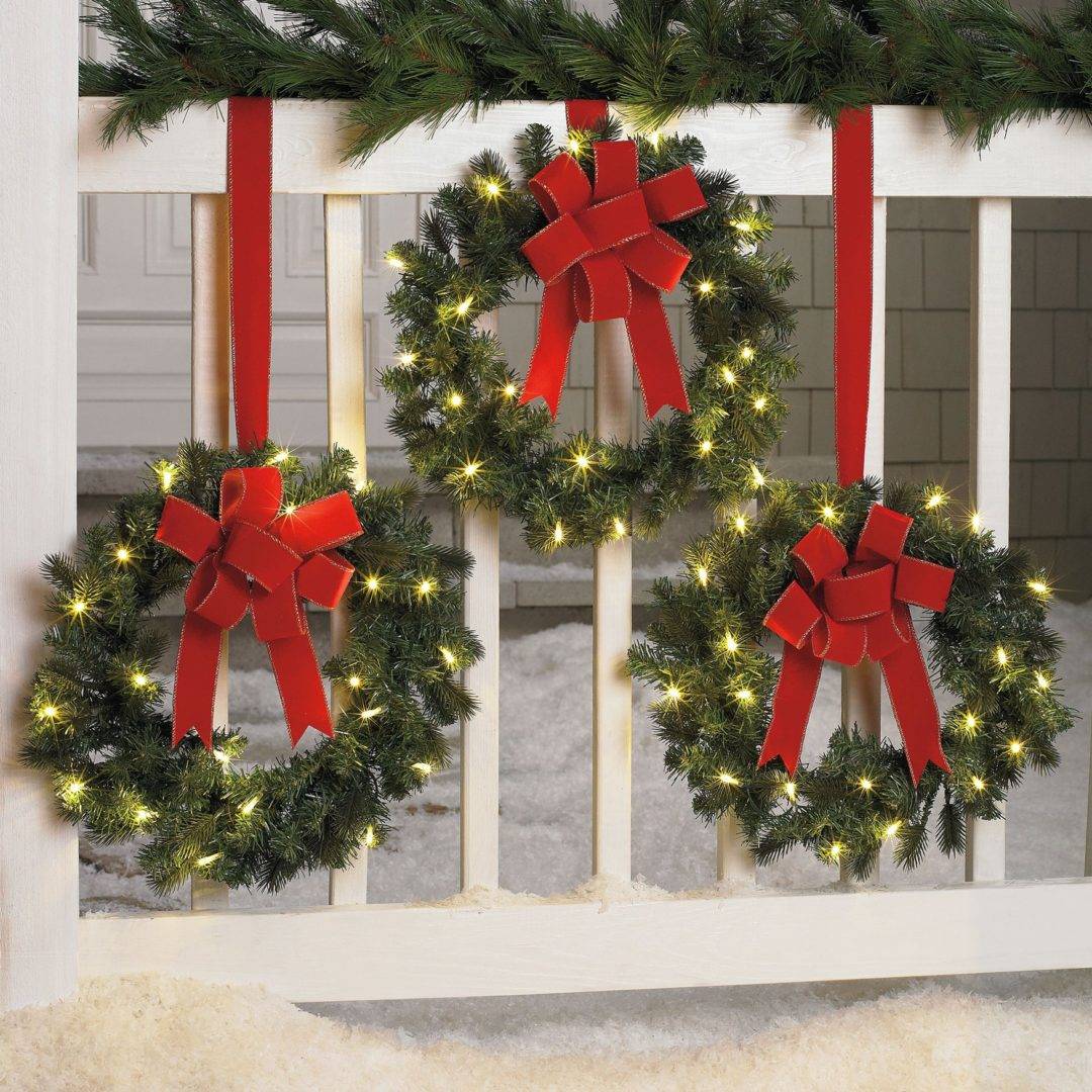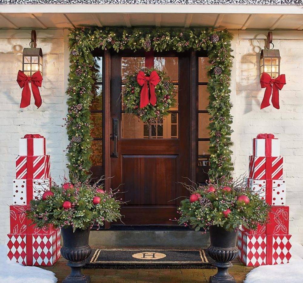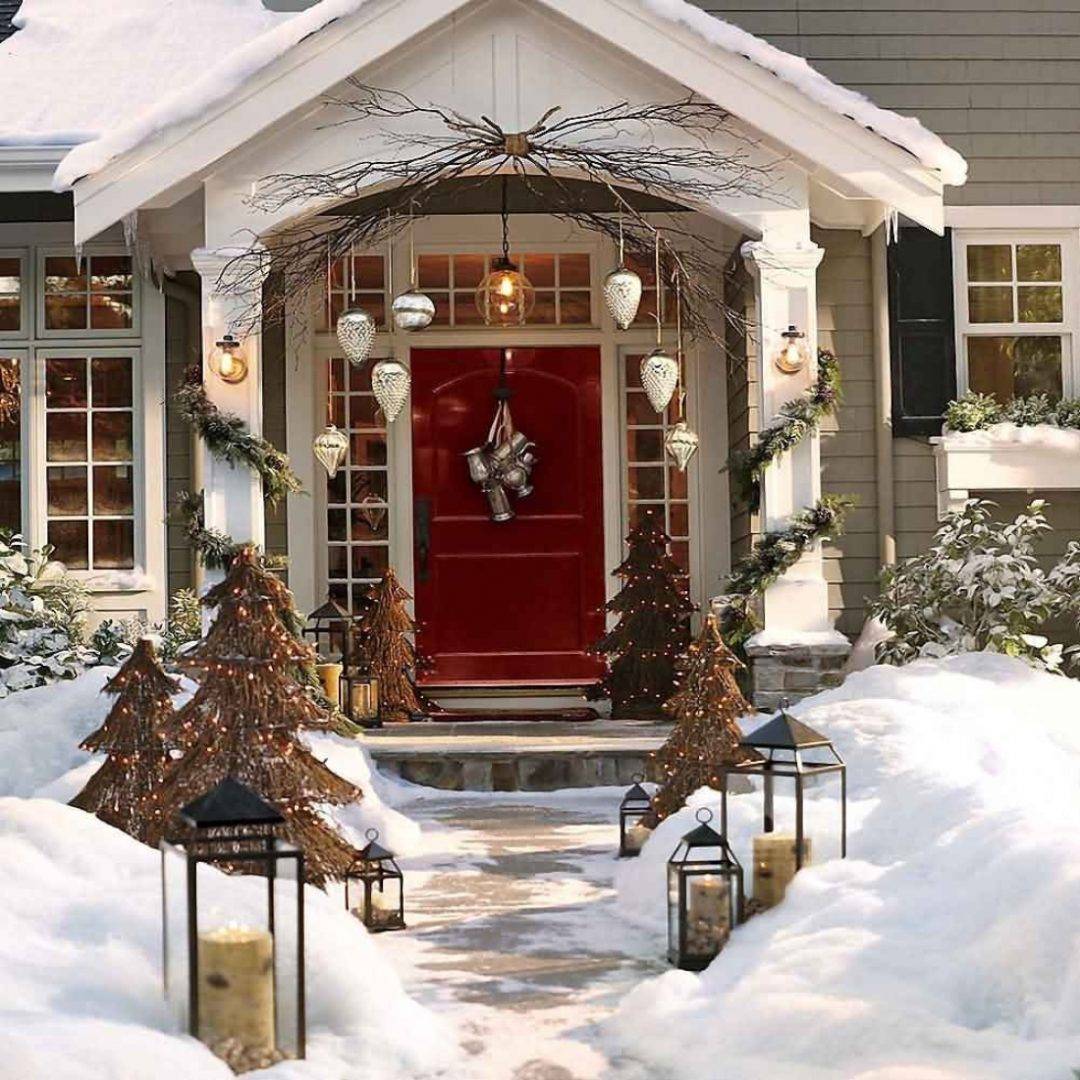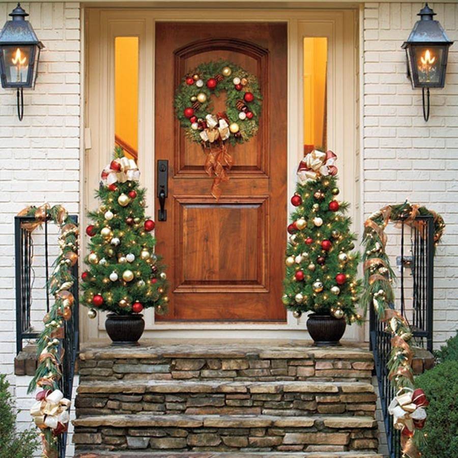 Не стоит забывать, что внимания требуют фасад дома и крыльцо. Беспроигрышный вариант – сверкающие гирлянды. Стильно они будут смотреться не только на крыльце дома, но и на крыше. Входную дверь украшают не только венками, но всевозможными декорациями из шариков, пластиковых фигурок, лент, искусственных еловых веток.