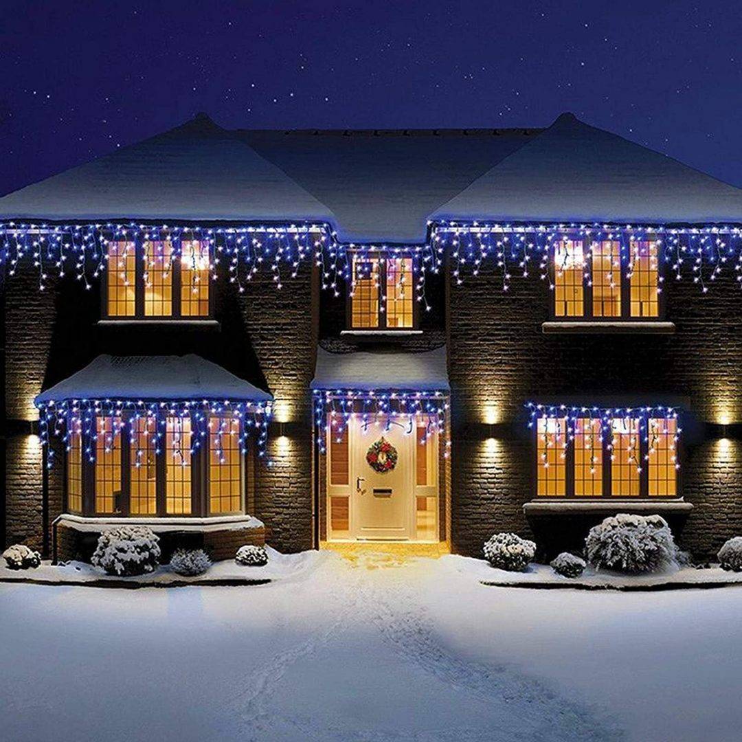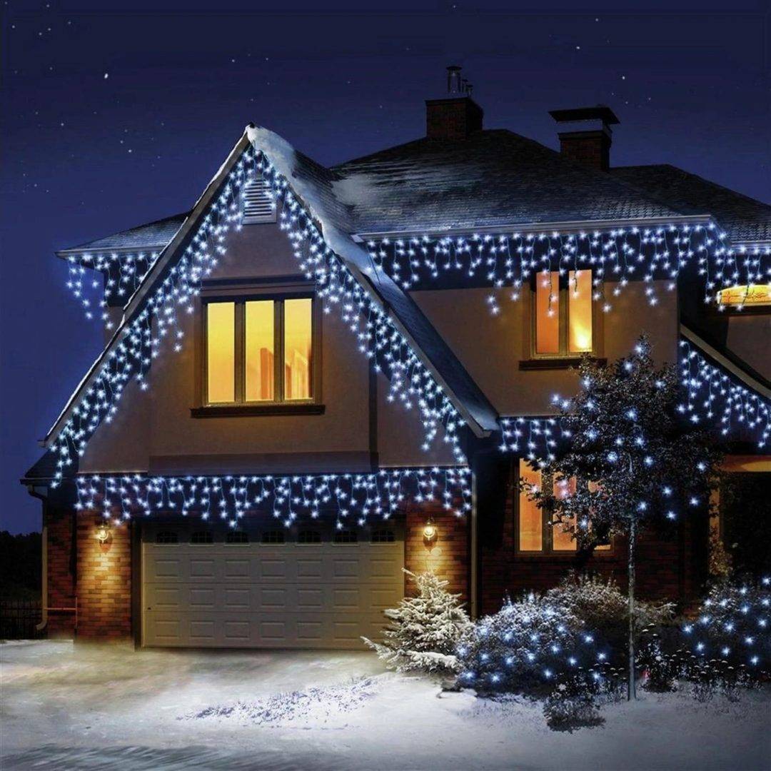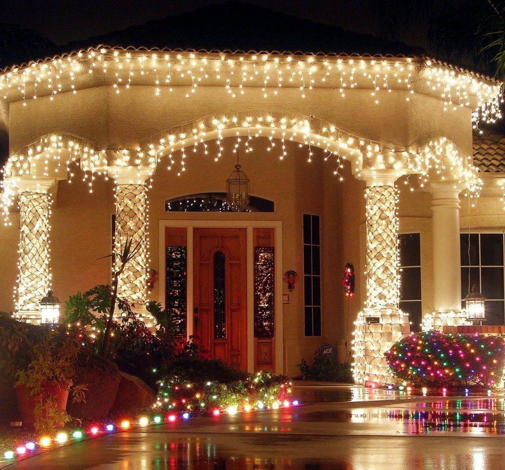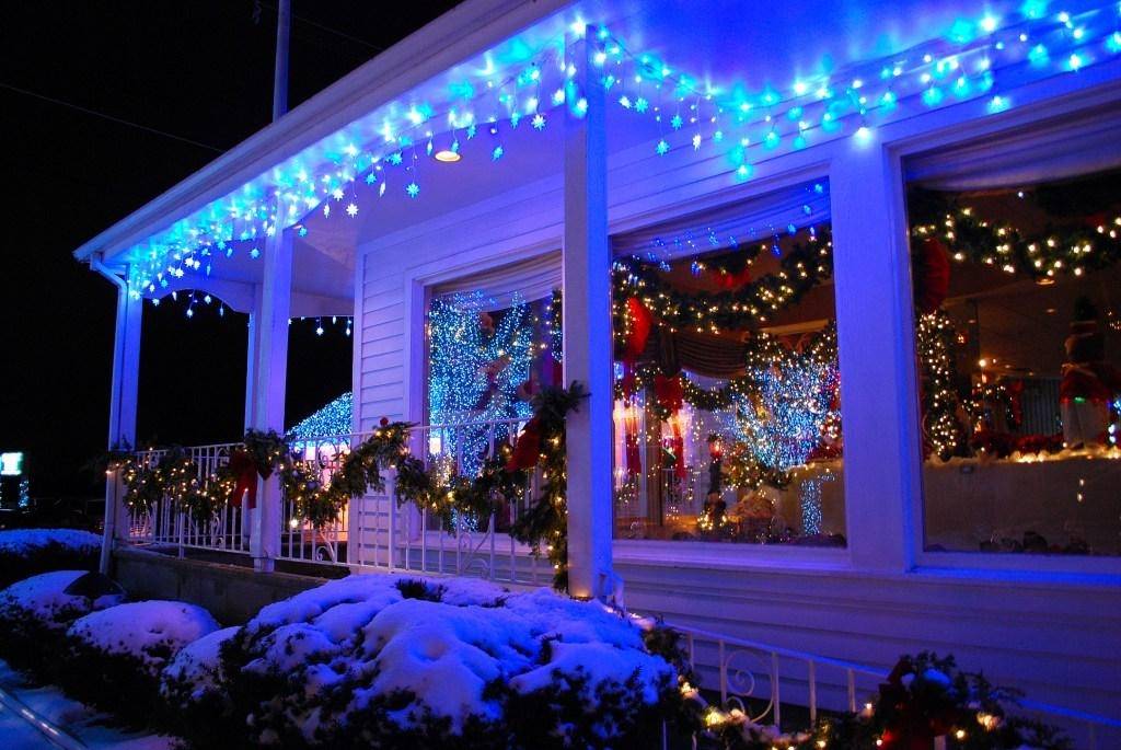 Не стоит забывать, что внимания требуют фасад дома и крыльцо. Беспроигрышный вариант – сверкающие гирлянды. Стильно они будут смотреться не только на крыльце дома, но и на крыше. Входную дверь украшают не только венками, но всевозможными декорациями из шариков, пластиковых фигурок, лент, искусственных еловых веток.
