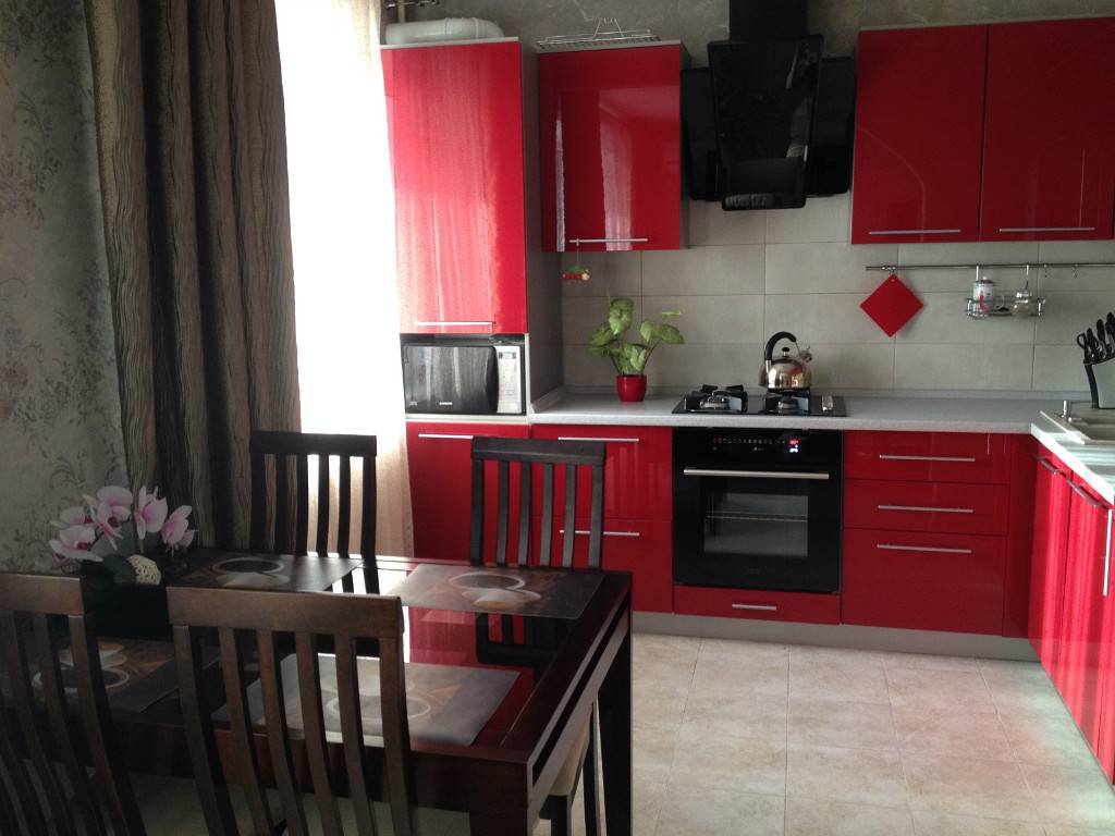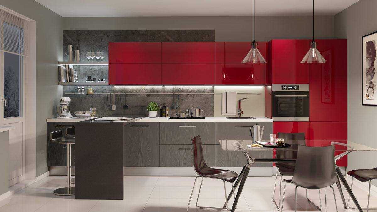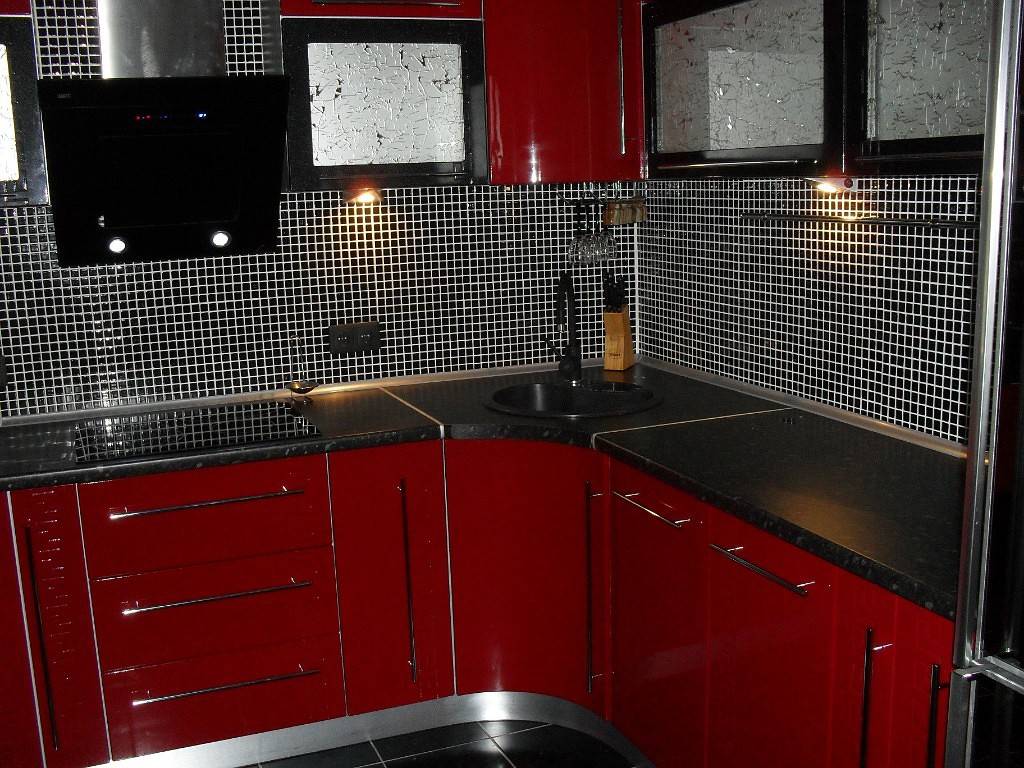 Бо́льшую часть площади фасадов в таких гарнитурах обычно занимает алый цвет. Если выбрать в качестве доминирующего чёрный, есть риск получить излишне мрачный и драматичный интерьер.