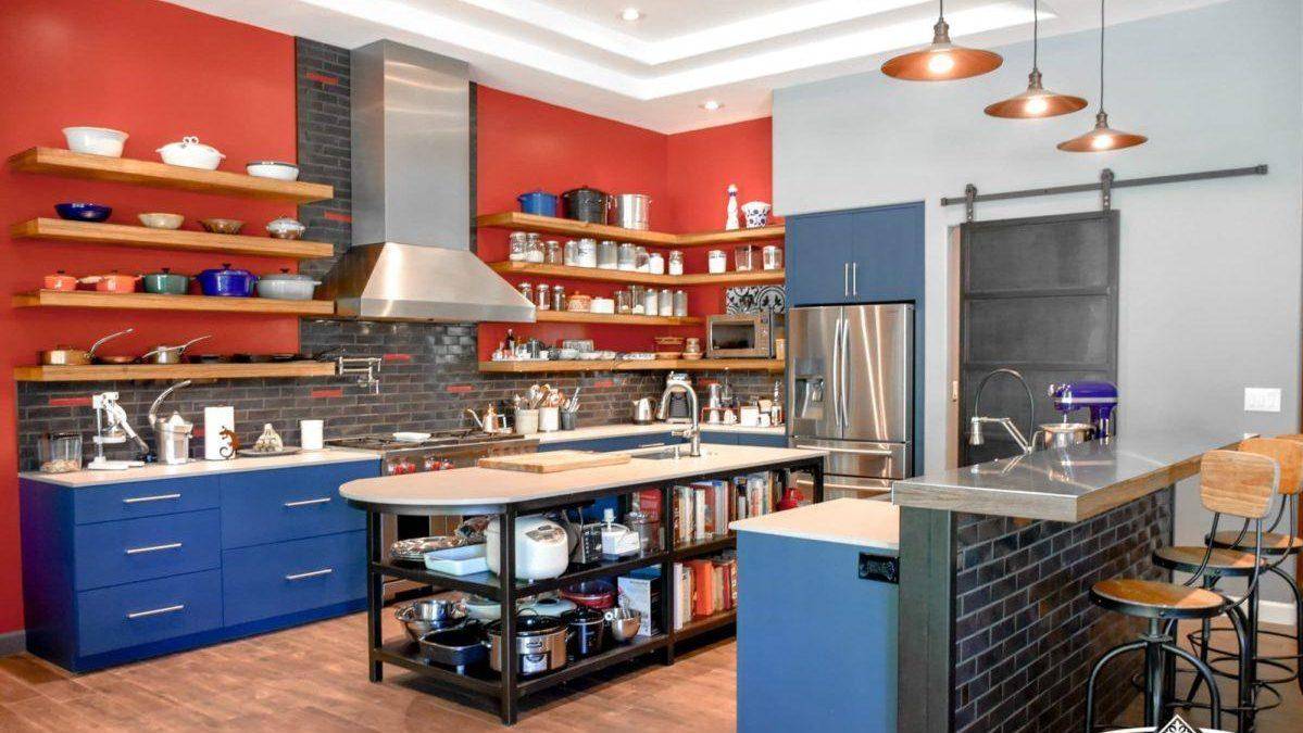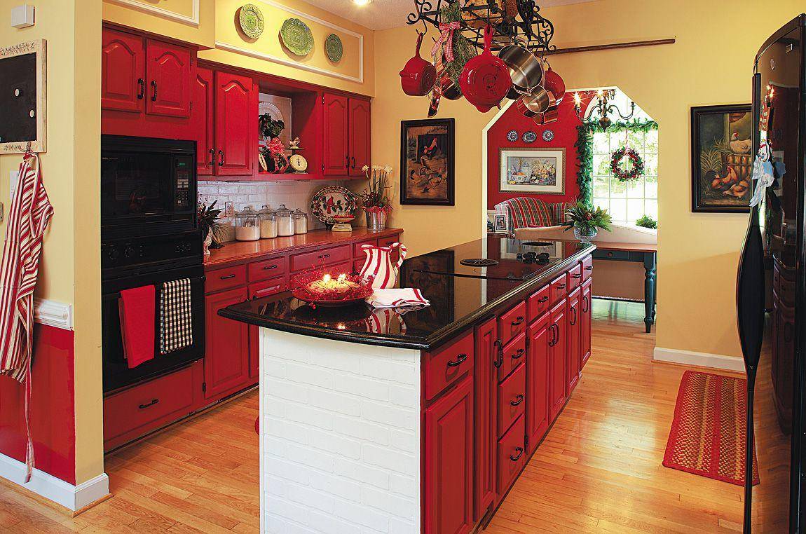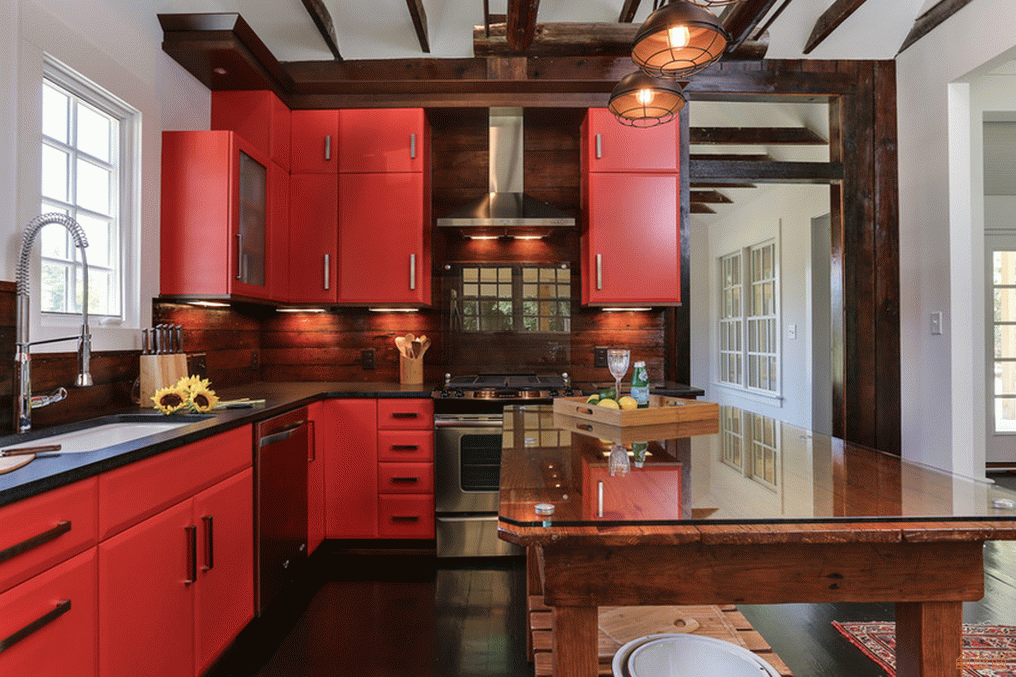 Для отделки стен подходят практически все материалы. Можно встретить много видов интересных однотонных или красочных красных обоев, но они могут оказаться не очень практичными для кухни — обои могут быстро прийти в негодность из-за пара и грязи.