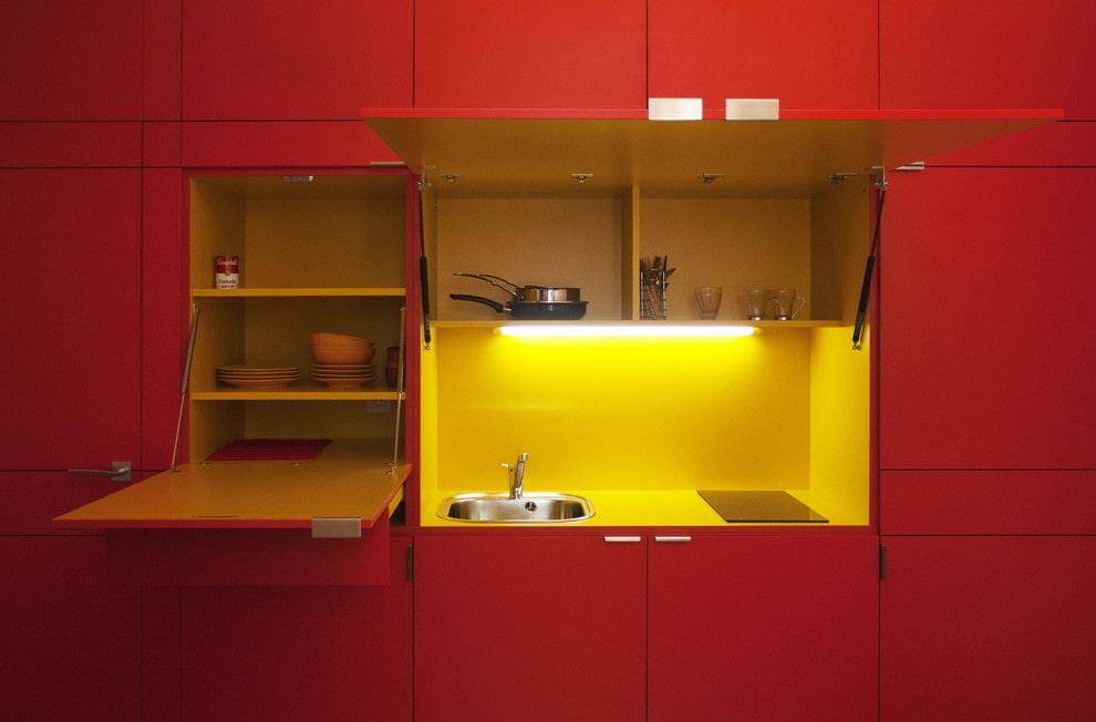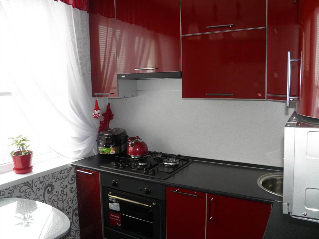 Обустраивая кухню небольших размеров, следует очень внимательно отнестись к выбору красных оттенков, так как этот цвет обладает особенностью визуально приближать и увеличивать любые предметы. Это означает, что придется отказаться от красного потолка или пола, если кухня небольшая. Также не стоит устанавливать гарнитур, полностью выполненный в ярких алых тонах.