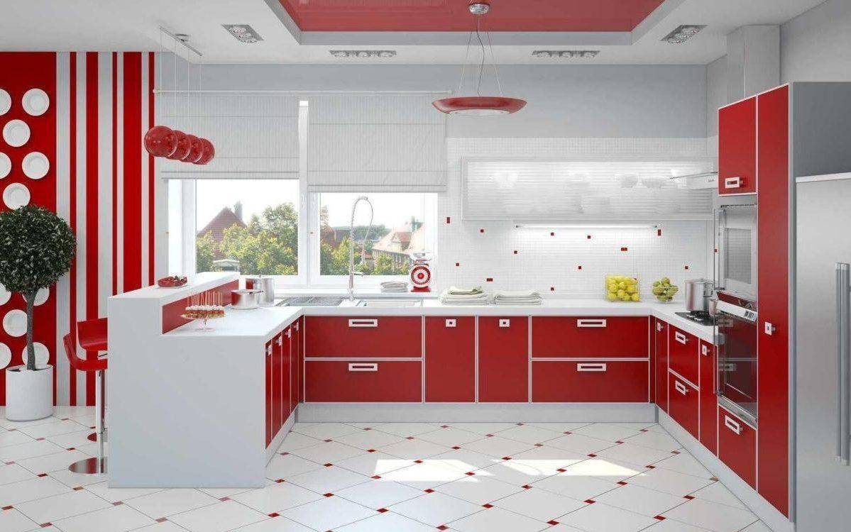 Современные производители предлагают такие решения, как наливной пол и керамогранит. Для обустройства потолка в красном цвете лучше всего использовать натяжные потолки, однако этот вариант будет удачным лишь в одном случае — если помещение кухни достаточно просторное и высокое. В маленькой и низкой комнате красный потолок будет смотреться крайне неуместно.