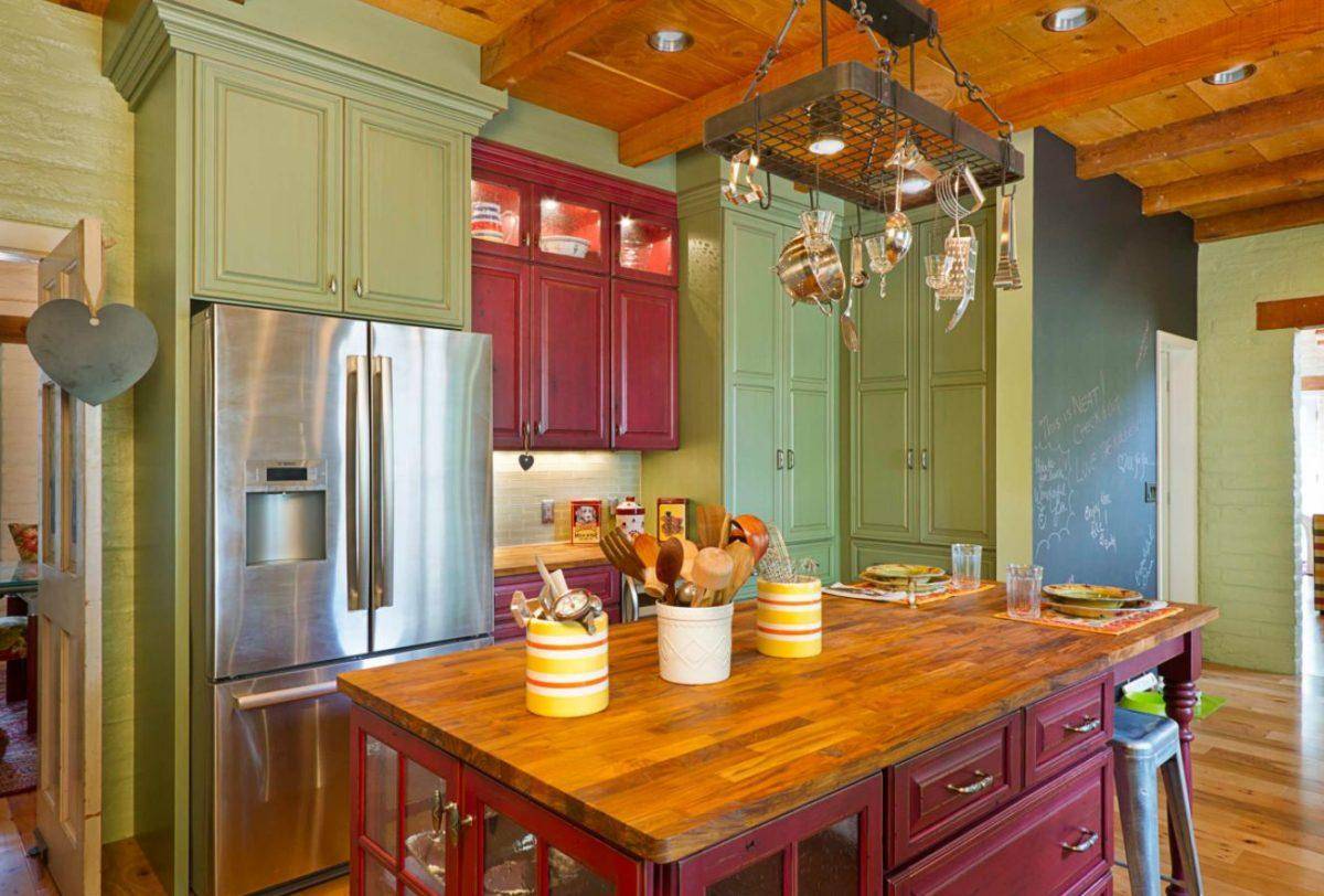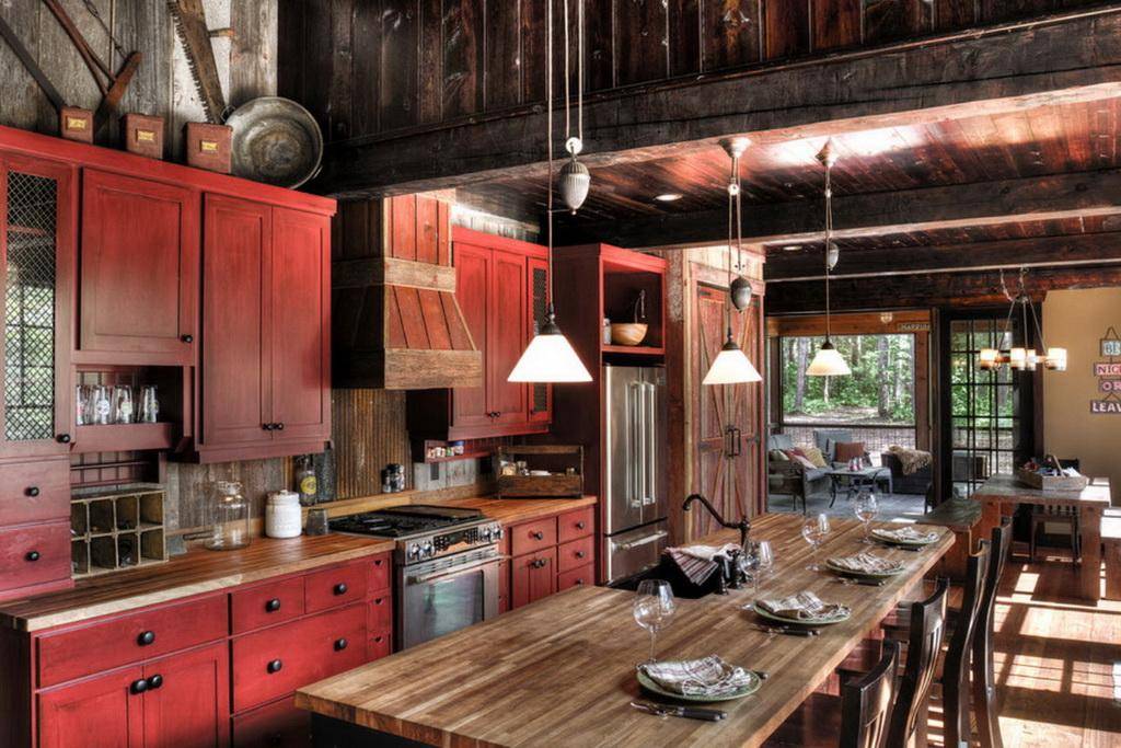 Этот вариант хорошо подойдёт для стиля кантри. Красный гарнитур в этом случае должен иметь матовые фасады и приглушённый цвет (темноватый или бледный). Уместно будет искусственное состаривание. Столешница и фурнитурные элементы выполняются из дерева, а фартук может быть выполнен в коричневой гамме.