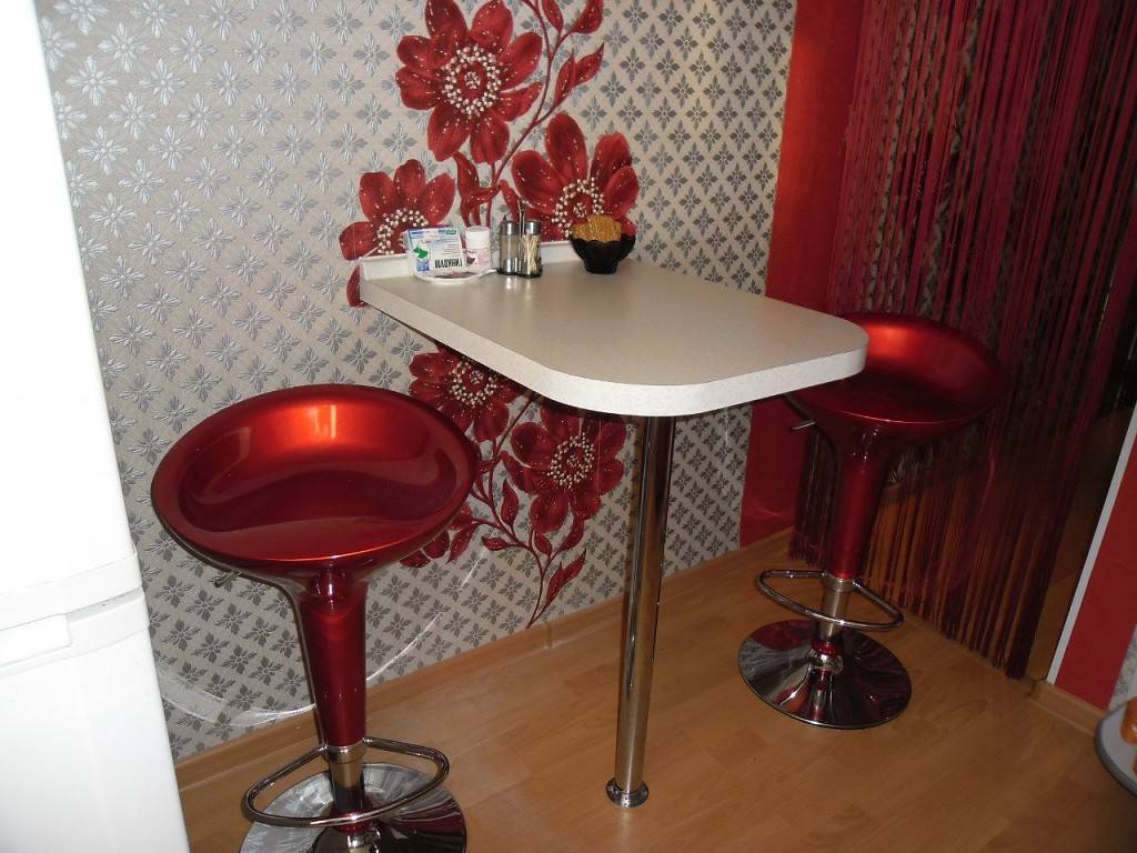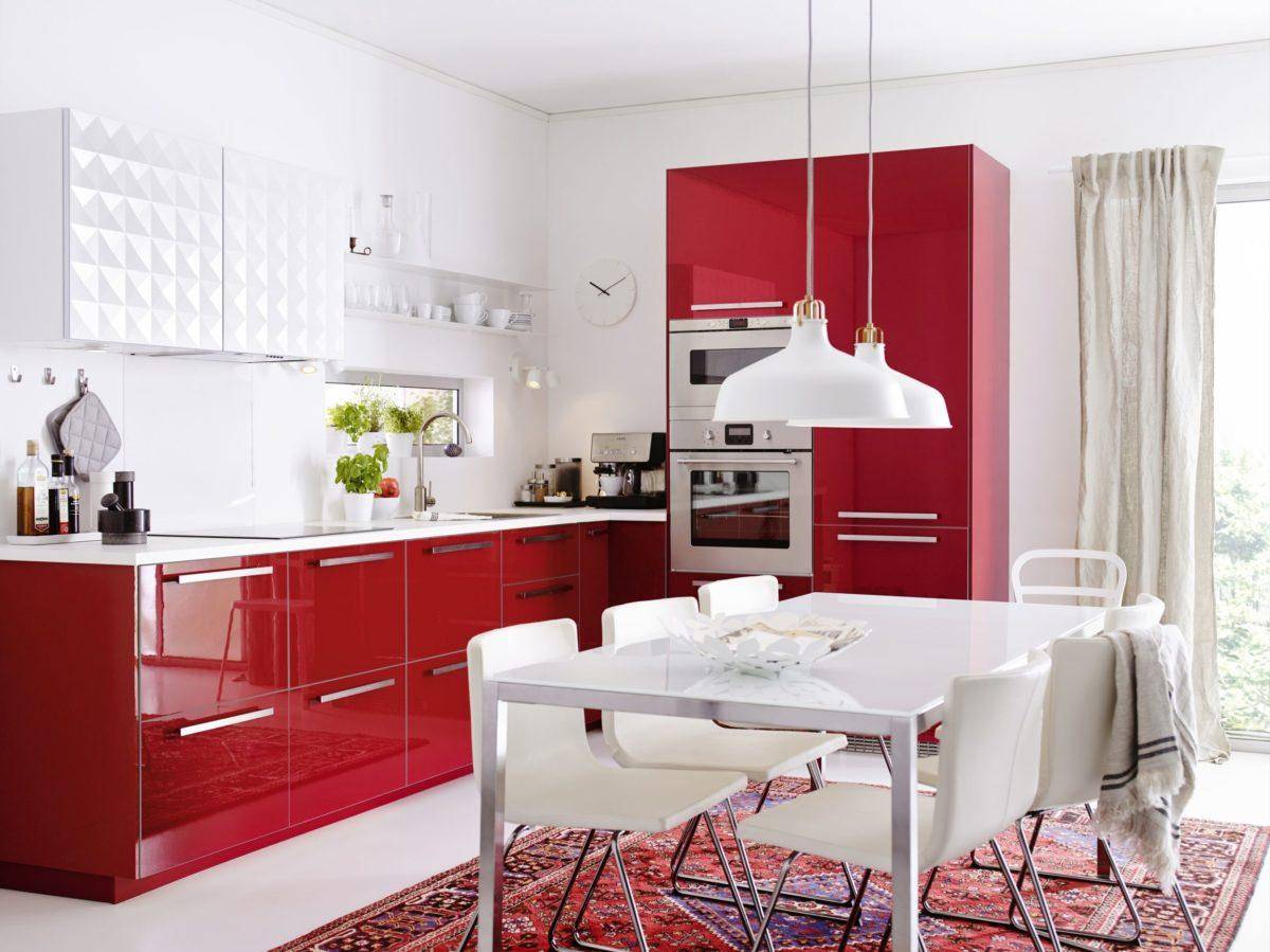 Стол и стулья — очень важная часть любого кухонного интерьера. Красные деревянные стол и стулья будут отлично смотреться в помещении, выполненном в стилях кантри, деревенский, шебби-шик, средиземноморский. Для кухни, интерьер которой выполнен в стиле минимализм или хай-тек, можно подобрать стол и стулья, выполненные из красного пластика и металла. Что касается столешницы, то она может быть стеклянной. Приветствуется наличие блестящих хромированных элементов.