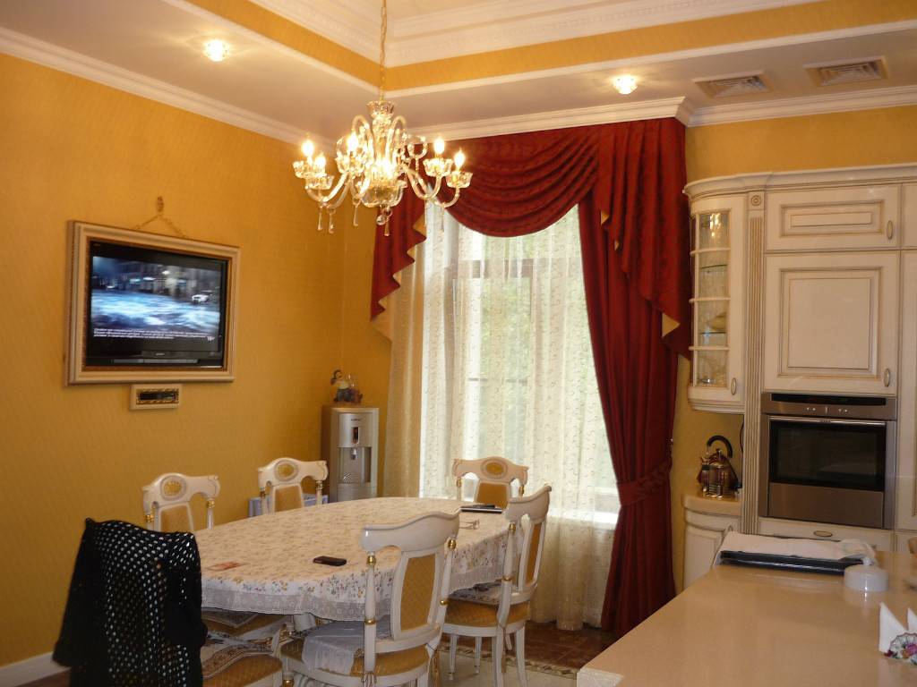 Шторы — в бордовом цвете они смотрятся очень респектабельно и дорого. Главное, использовать только качественный натуральный текстиль. Если кухня достаточно просторная, а окна большие, можно повесить длинные тяжелые портьеры, ниспадающие вниз мягкими складками.