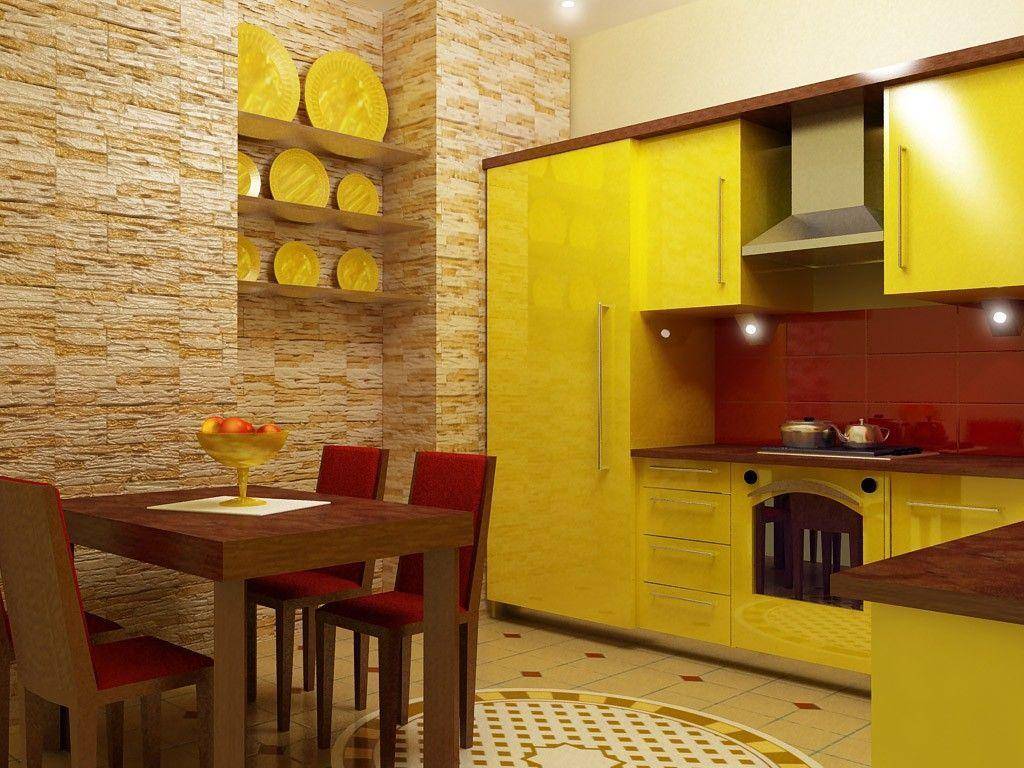 Гарнитур в такой гамме создаёт в помещении солнечную атмосферу и подойдёт для плохо освещаемой кухни, окна которой выходят на север. Но, чтобы дизайн не воспринимался слишком «горячим», его нужно разбавлять нейтральными тонами – бежевым, светло-коричневым, молочным.