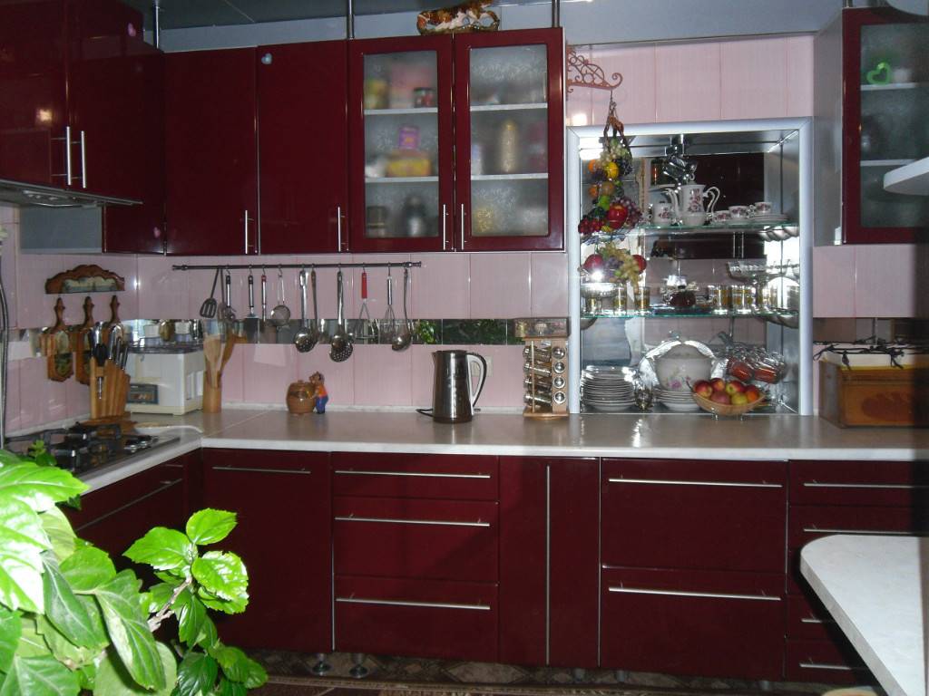 Кухонный гарнитур — отличным решением станет выполнение фасадов в бордовом цвете (нижних либо верхних, или сразу всех). Дополнить изысканность этого предмета интерьера поможет хромированная металлическая фурнитура, а также стеклянные элементы (стекло может быть матовым или прозрачным).