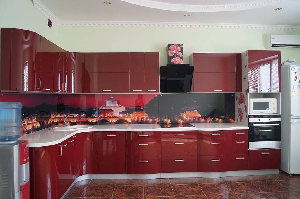 Столешница и фартук — очень важные элементы интерьера кухни, способные придать динамичную изюминку общему дизайну помещения. Для обустройства фартука в красном цвете можно использовать такие материалы, как мозаика, керамическая плитка, однотонное стекло, плитку с рисунком, стекло с печатью на нем.