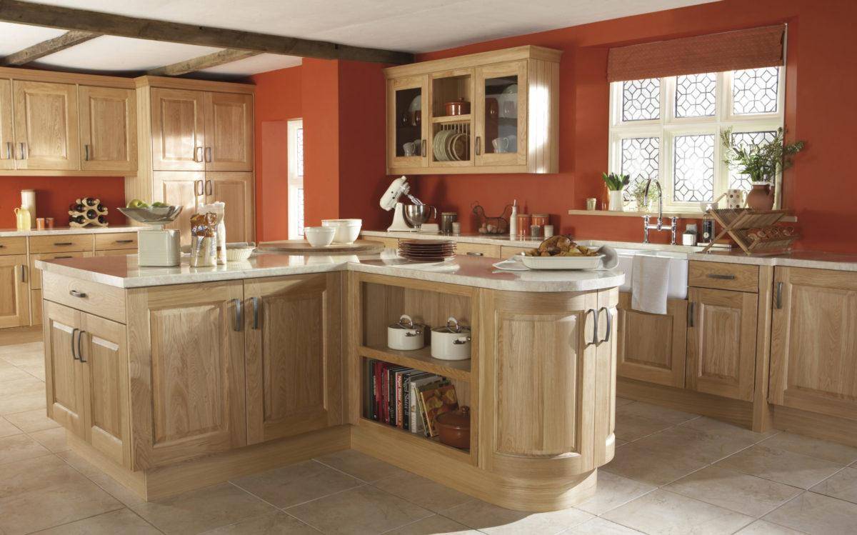 Цвет фоновой стены для кухонного гарнитура красноватых оттенков должен быть спокойным. Выбирают однотонное покрытие, без рисунков. Подойдет окрашивание или обои под покраску. Рекомендуется сделать стены идеально ровными, чтобы взгляд не цеплялся за швы и не портилось общее впечатление от дизайна. Остальные стены на большой кухне могут быть оформлены в темных оттенках, для малогабаритного применяют светлые расцветки.