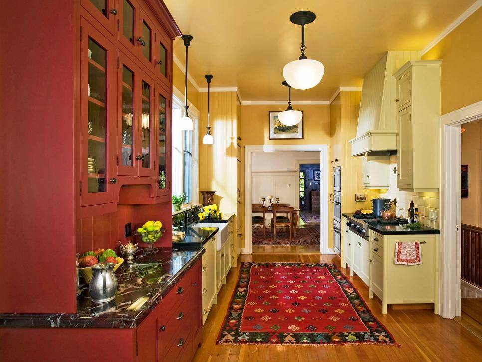 Пол и потолок — красный пол на кухне можно считать достаточно редким явлением, однако отказываться от такого варианта не следует. В качестве материала можно использовать традиционное дерево либо керамическую плитку, а также обычный линолеум и ламинат.