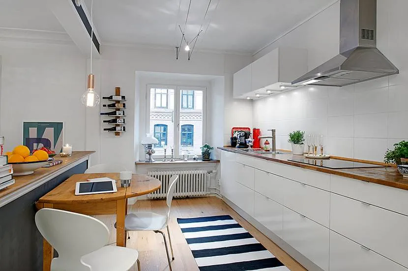 Расположение мебели вдоль одной или двух противоположных стен – оптимальное решение для узких кухонь. При этом высоту стен стоит максимально задействовать, используя навесные шкафчики и системы хранения под потолок. Но не забывайте о качестве освещения, поскольку небольшого окна в конце комнаты может быть недостаточно для необходимого на кухне количества света.
