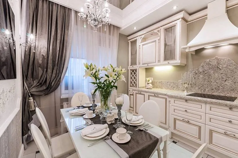 - Отличие классических кухонь заключается в мощности. Для визуального облегчения применяют светлые тона, применяемые вместе с обоями и многими другими фактурами.