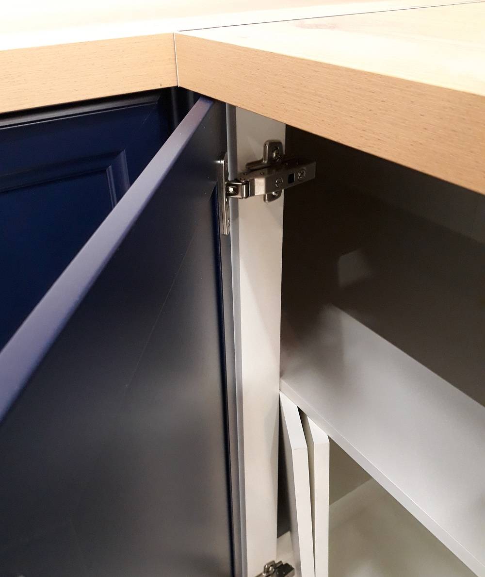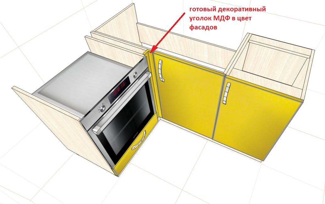 В частности, элемент стыковки нередко заменяют цельным уголком 50х50мм. В этом случае фасад либо перевешивают на другую сторону на петли с увеличенным углом открывания.