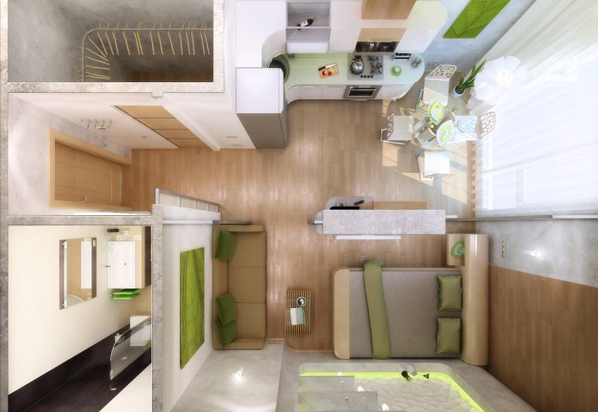 Для этого важно грамотно зонировать помещение и при планировке максимально полезно использовать каждый свободный сантиметр. Для небольших помещений существуют определенные декораторские приемы, способные зрительно расширить пространство или визуально «поднять» высоту потолков