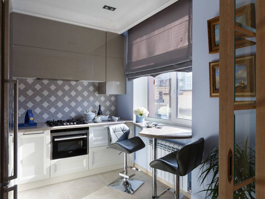 Если вы уж решили реорганизовать свою маленькую кухню, так используйте каждый квадратный метр. Вместо обычного подоконника установите столешницу, которую можно использовать как рабочий или обеденный стол. Он может стать барной стойкой, в компанию к которому отлично подойдут красивые барные стулья.