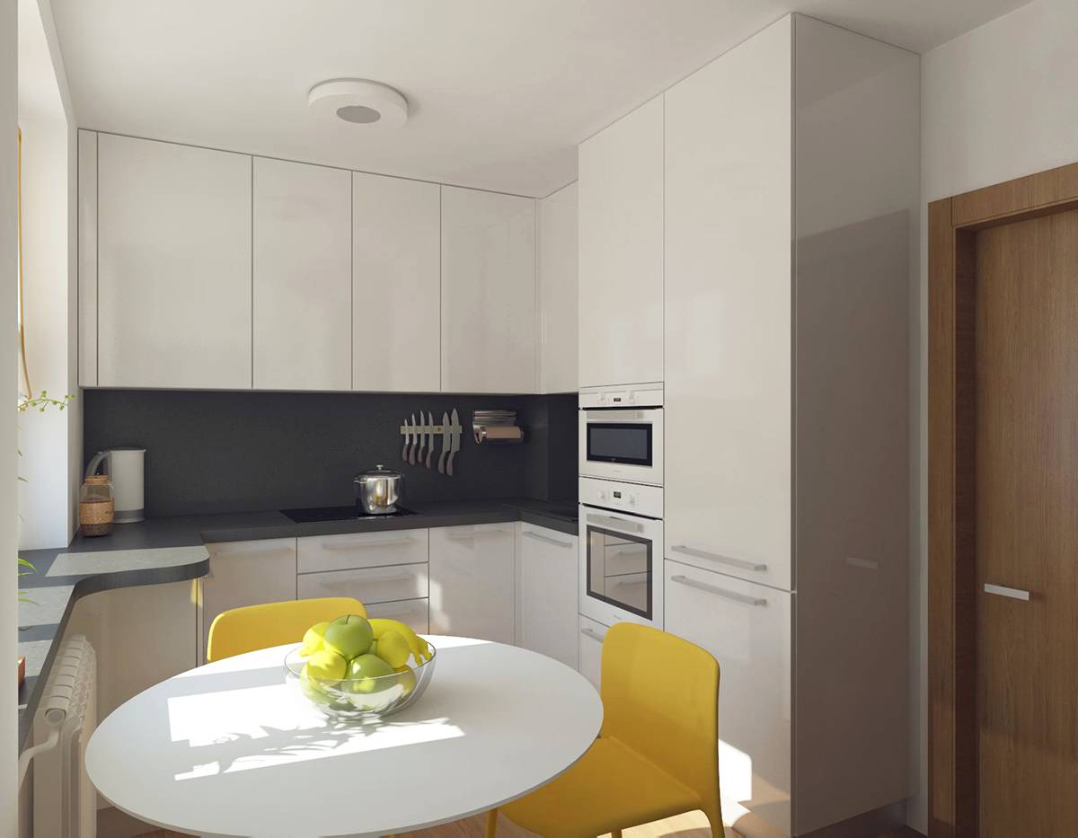 Дизайн угловой маленькой кухни, помимо рабочей зоны, предполагает обустройство и места для приема пищи. Большой обеденный стол здесь, конечно, будет не уместен, а вот высокая барная стойка со стульями, а также аккуратный круглый или овальный столик вполне подойдут. Довольно удобно использовать раскладные конструкции.