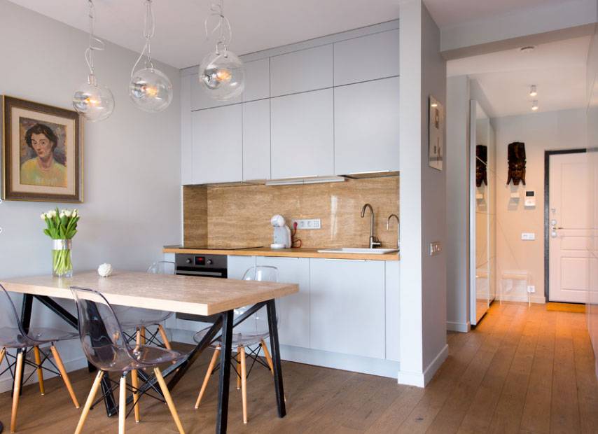 Дизайн маленькой кухни будет выглядеть более просторным вместе с малогабаритной мебелью. Для скандинавского или минималистичного стиля будут кстати стулья из прозрачного пластика. Подойдут барные стулья или мебель-трансформер, которую можно легко спрятать в нужный момент.