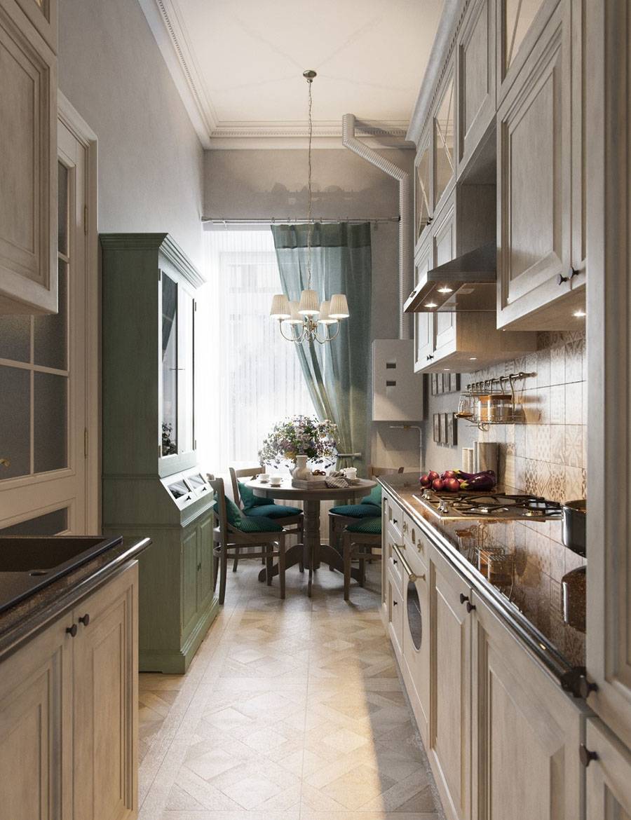 Решение может быть следующим: навесные шкафы в полный рост и раскрывающийся стол, чтобы не загромождать проход. В таких случаях удобно холодильник и зону готовки разнести в разные стороны, так пространство эргономичнее.