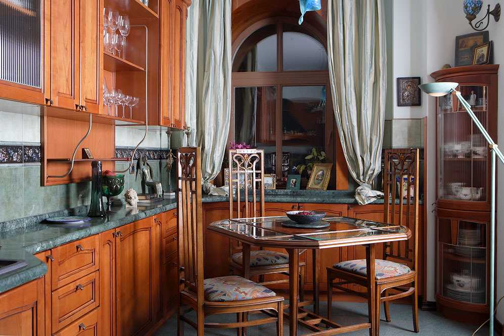 Честно говоря, в современных интерьерах такое оформление окна встретишь редко. Да и для кухни с балконной дверью не очень практичный вариант. Как любят говорить, «дорого, богато», но на деле часто получается совершенно безвкусно.