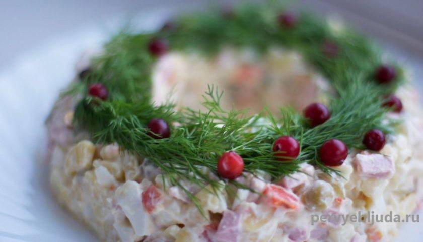 За основу вы можете взять свой самый любимый рецепт приготовления, а вот украсить его можно например вот так, как на этом фото, или сделать настоящий кулинарный шедевр в виде елочки из укропа или из зеленого горошка. Смотрится по настоящему очень нарядно и красиво.