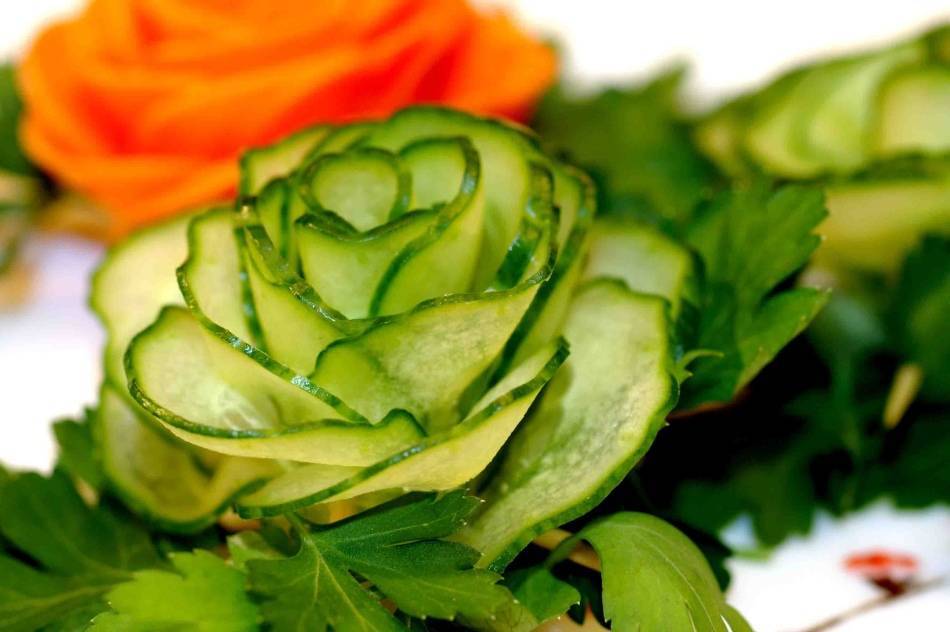 Так же как и помидор, огурец — отличный материал для украшения абсолютно любых салатов. Тонко нарезанные слайсы огурцов всегда могут стать цветком, где каждый кусочек имитирует отдельный лепесток. Причем, использовать можно как свежий, так и маринованный овощ.