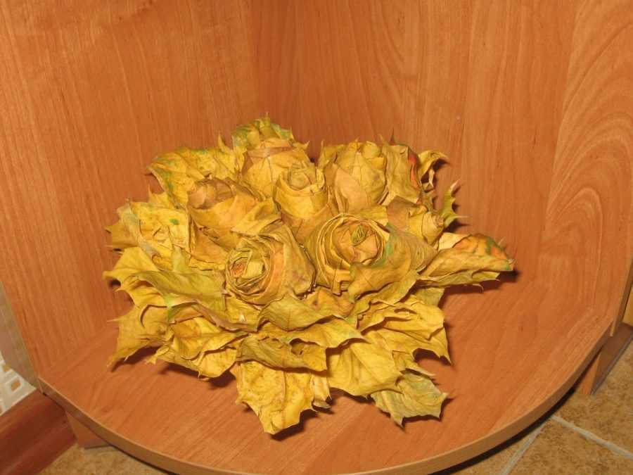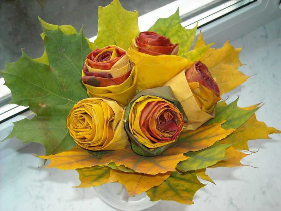 Из сухих или слегка подсушенных листьев клена можно сделать прекрасные розы. Розы из листьев вызовут восхищение у всех посетивших осенний бал, а делаются они очень просто. Лист нужно сложить пополам, а потом скрутить в трубочку, затем нужно прикладывать к полученной сердцевинке другие листья и загибать их назад. Когда розы из листьев будет сделаны их нужно зафиксировать внизу нитью и обработать лаком для волос.