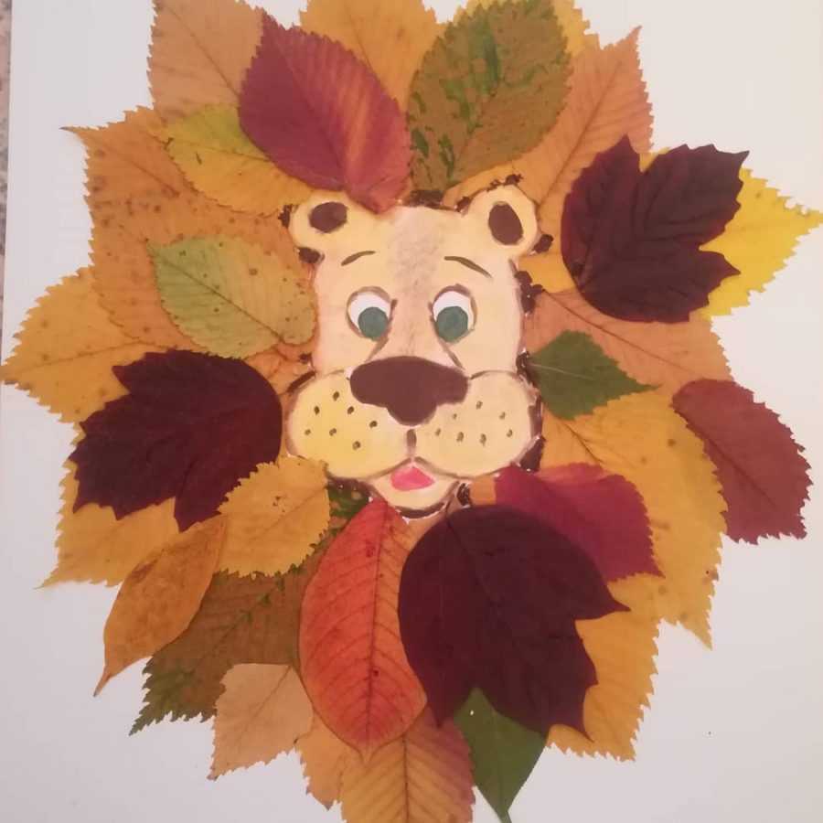 Если вы хоть немного умеете рисовать, нарисуйте мордочку ежа, совы или льва и контур тела, который ребенок заполнит листьями. Примеры фото осенних поделок дадут вам отправную точку.