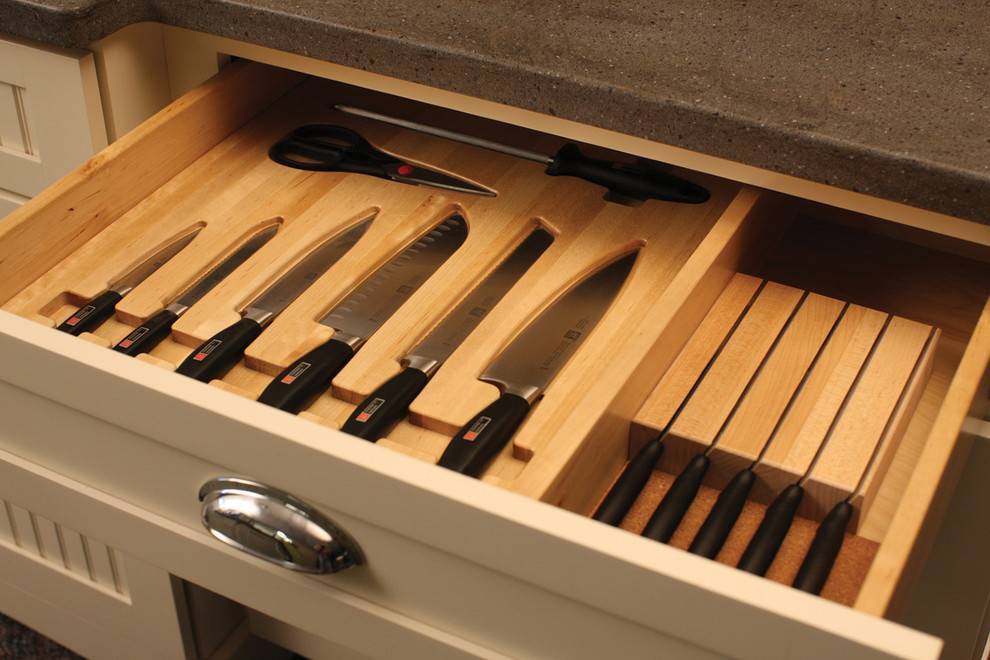 Хотя, если хранение ножей у всех на виду вас по каким-то причинам не устраивает, постарайтесь подобрать наиболее безопасный, по вашему мнению, способ. Так, некоторые производители выпускают простые и комфортные секции для выдвижных ящиков, где у каждого наименования будет своё отдельное место, а острые лезвия не смогут никого поранить.