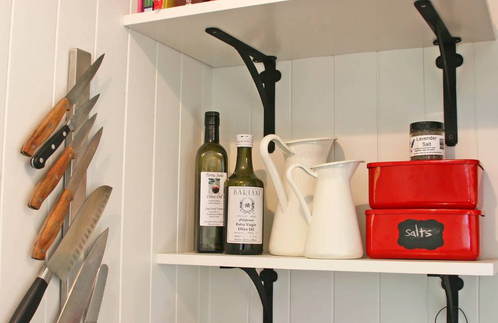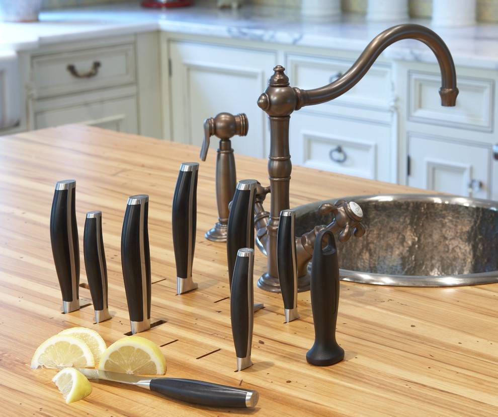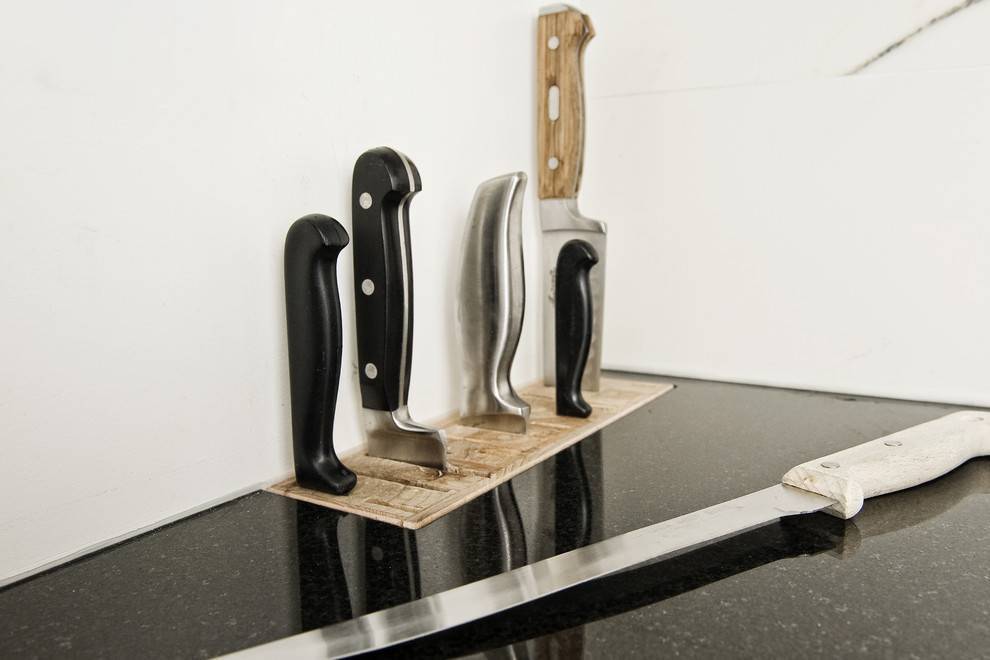 Работаете ли вы над новым дизайном или стараетесь оптимизировать существующий — обратите внимание на возможность хранить ножи на стене, прикреплёнными к магнитной планке, или внутри специального блока, например, встроенного в столешницу. Оба эти варианта удобны и безопасны, они обеспечивают лёгкий доступ к нужным вещам в любых условиях. Особенно это актуально тогда, когда ваши руки в чём-то испачкались в процессе работы, а вам срочно требуется другой нож