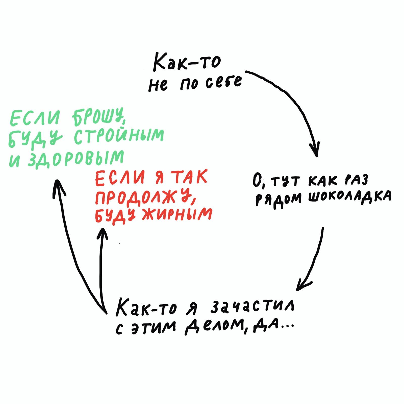 Ночная шоколадка — это же не просто душевный порыв, это организм просит подкинуть дровишек. Нельзя просто игнорировать его сигналы, он возьмёт своё. Сигаретка — это антистрессовый ритуал, и если его не провести, ты начнёшь практиковать ещё более разрушительные ритуалы. Соцсети часто нужны тогда, когда в жизни больше нет ничего интересного. Не будешь же ты смотреть в потолок. Нужно искать занятия и вещества на замену.