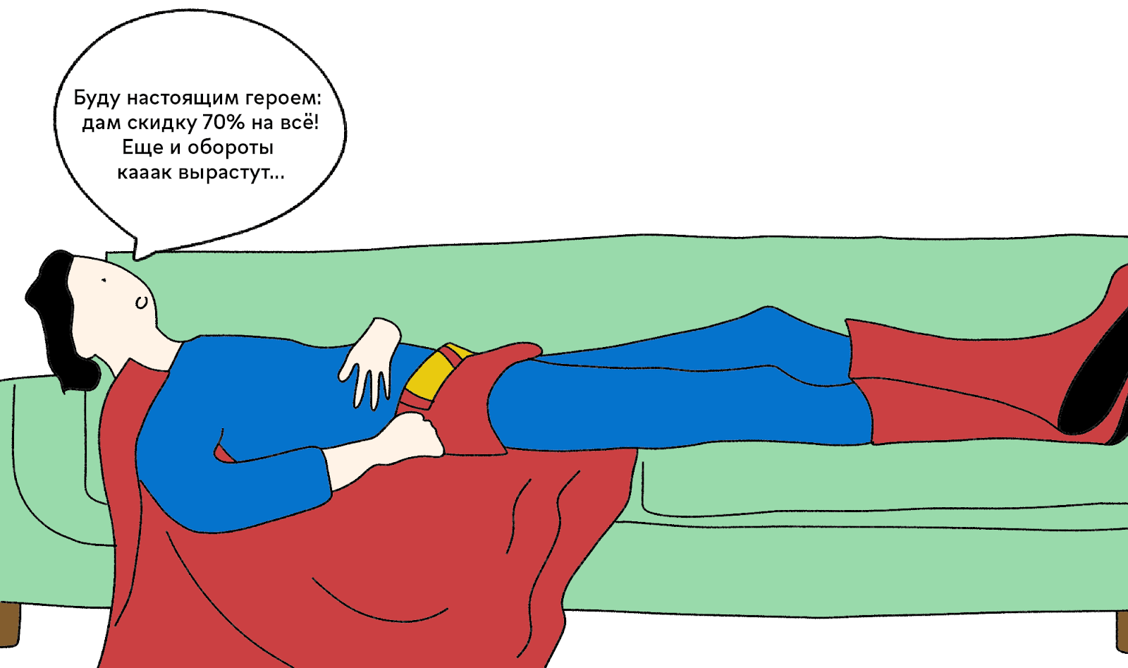 К чему приводит привычка. Если не просчитывать эффект от скидок, компания может уйти в убыток: скидки сожрут всю прибыль, у компании начнутся кассовые разрывы, а потом — кредиты, долги, банкротство и вот это всё.