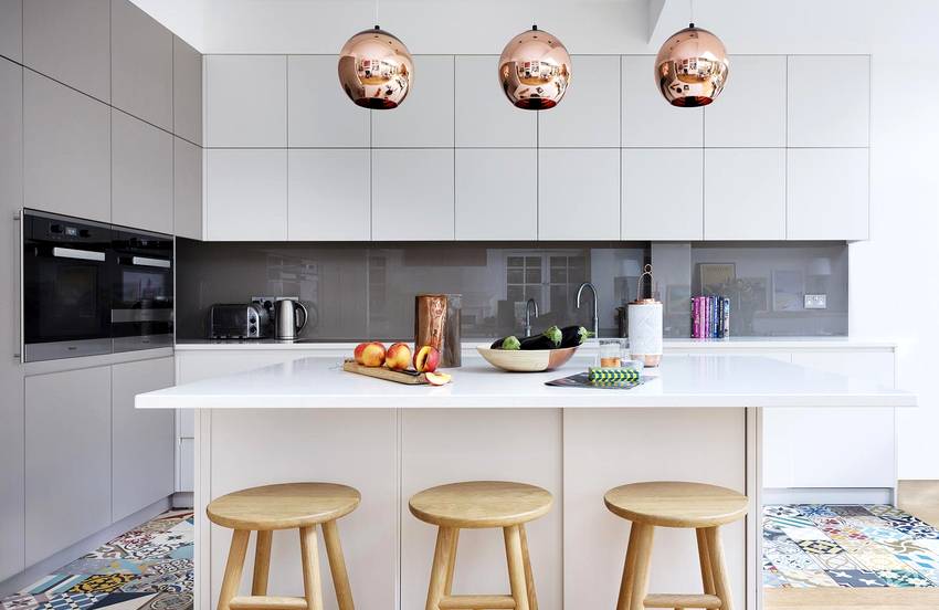 Белоснежное изделие способно вписаться в любой стиль интерьера. Оно может быть изготовлено из матового стекла, хрусталя или непрозрачного пластика. Такой осветительный прибор выигрышно будет смотреться в сочетании с деревянной мебелью и светлой отделкой помещения. Люстра может гармонично раствориться в дизайне бело-серой кухни с легким и воздушным интерьером.