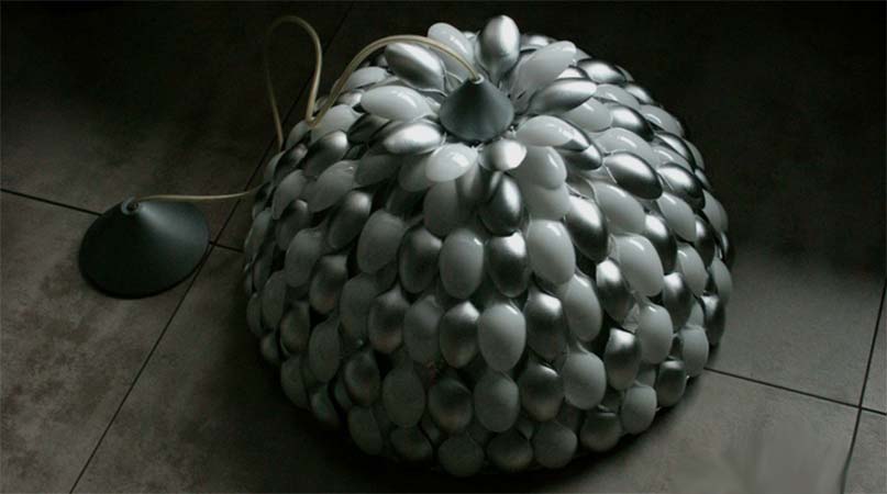 Абажур из ложек идеально впишется в интерьер кухни. Материалом для его изготовления являются обычные ложки из пластика. В качестве каркаса изделия подойдет большая пластиковая бутыль.