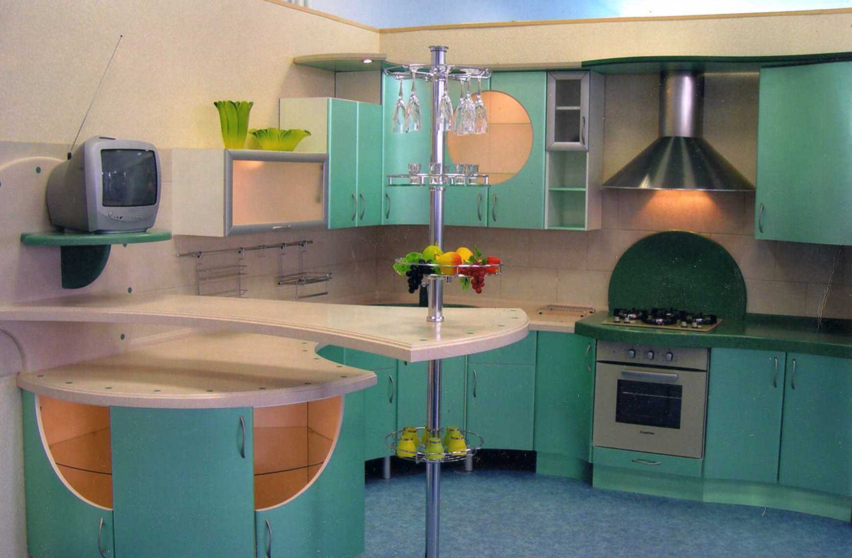 Хромированные мебельные ножки (опоры) и закругленные формы самих стоек дизайн кухни только испортят.