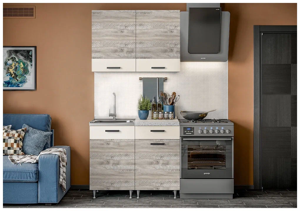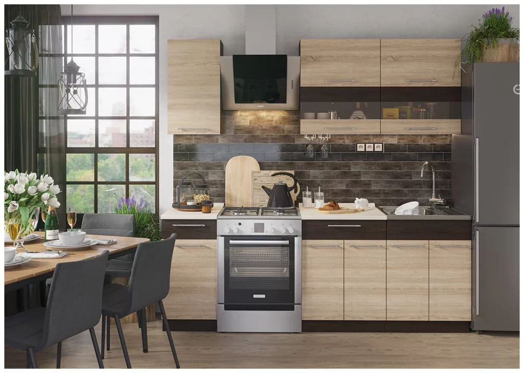 Практичный набор по адекватной цене. Дубовый оттенок сонома зрительно уменьшает габариты мебели. При внешней невесомости модель обладает вместительностью. Двойной ряд верхних шкафчиков позволит пользователям хранить множество продуктов и посуды.