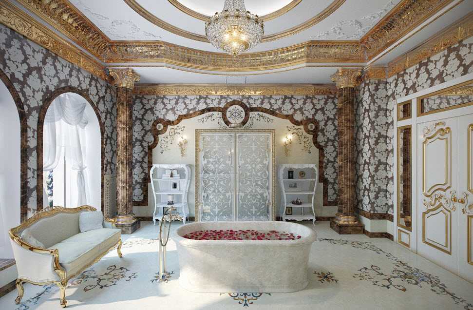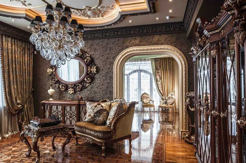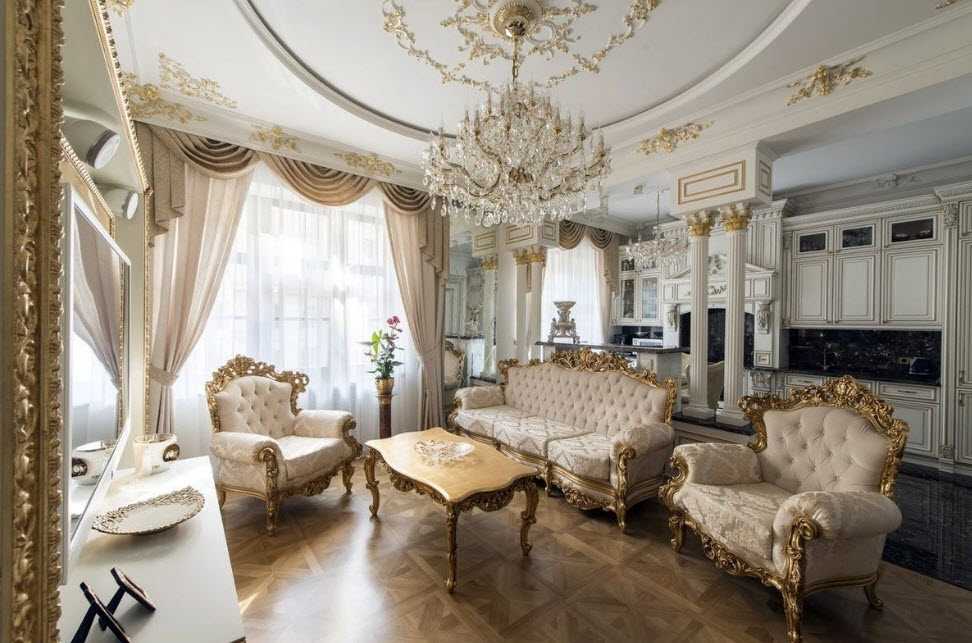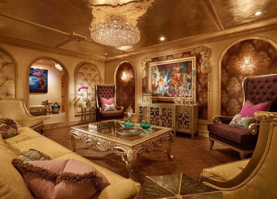 В барокко интерьерах напыщенная роскошь удивительным образом сочетается со стилем и элегантностью. Такое оформление часто выбирают знаменитости, политические деятели, владельцы загородной недвижимости.