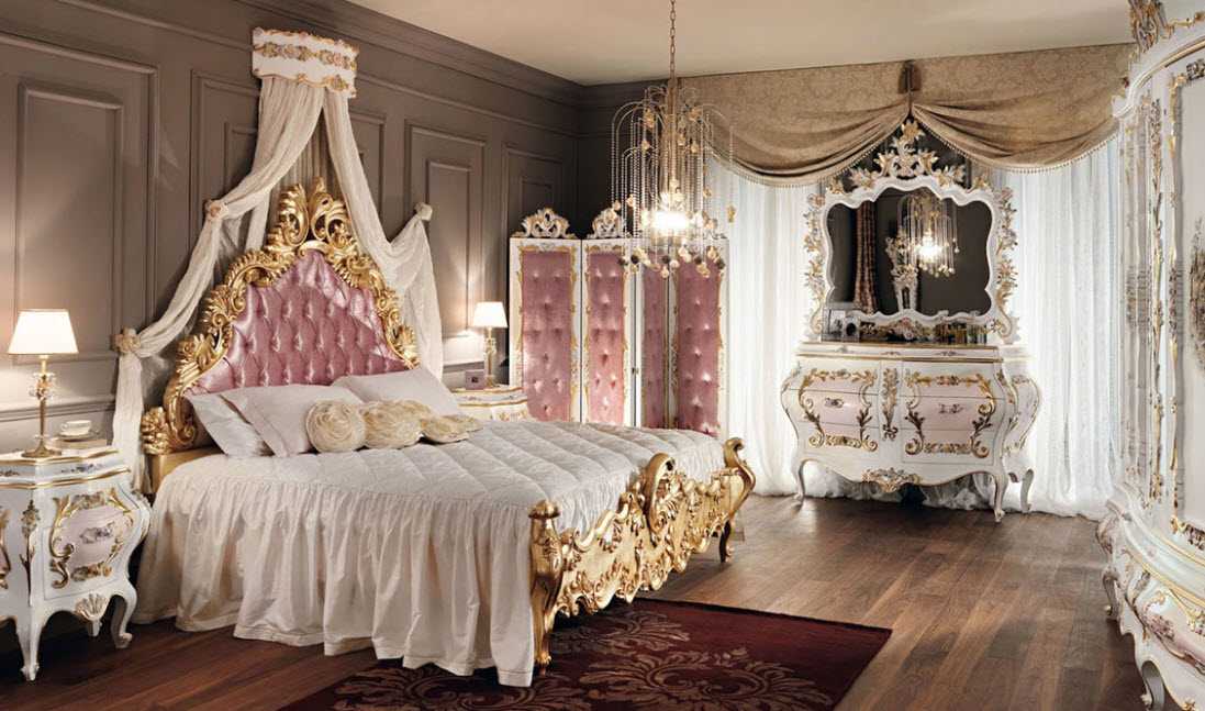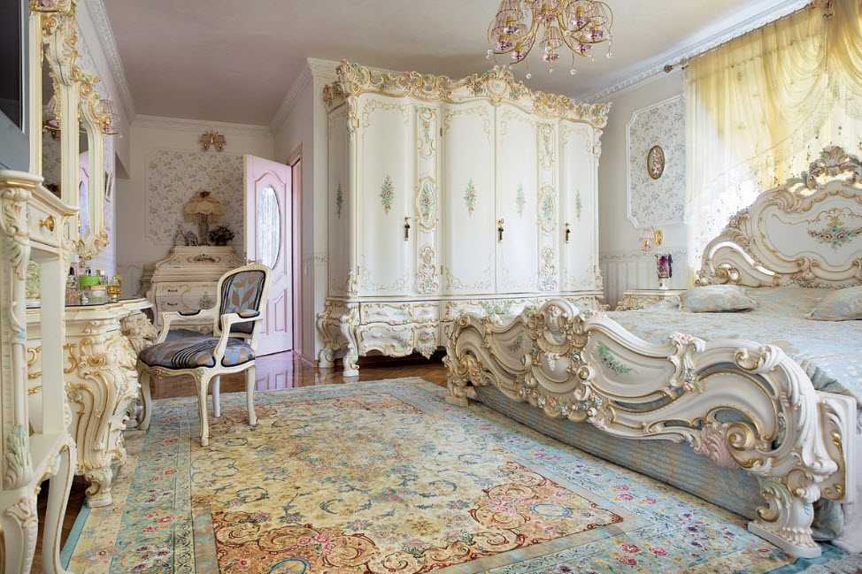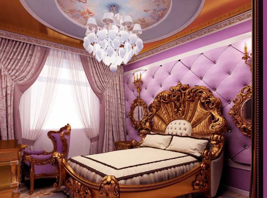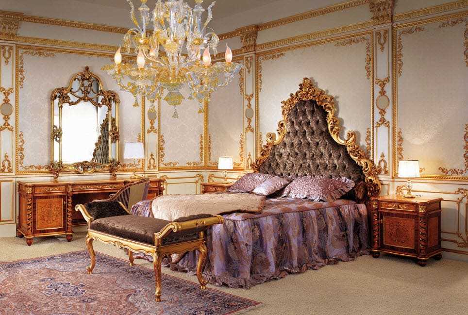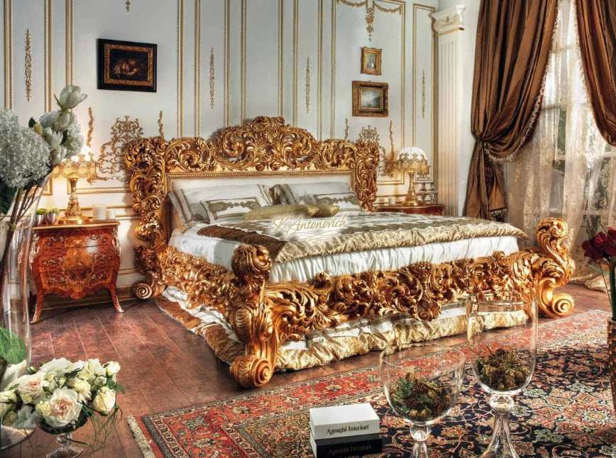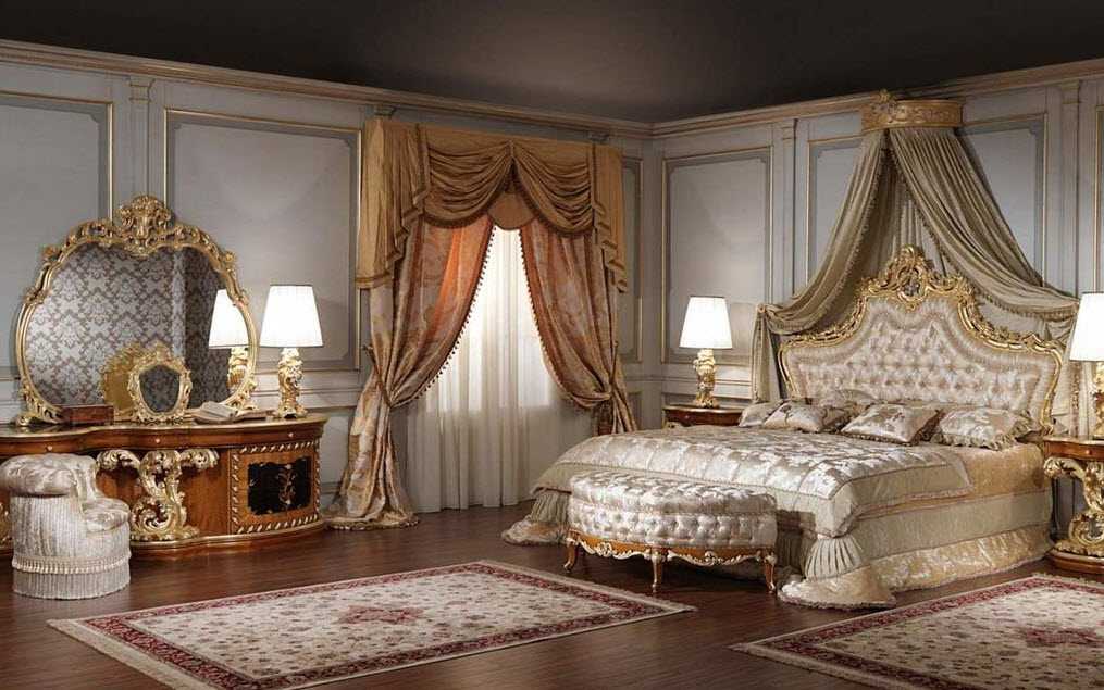 Кровать – основной элемент спальни, вокруг оси которого строится симметрия интерьера. Ложе с резными изголовьем и изножьем выглядит огромным. В направлении часто используют конструкцию под балдахином, напоминающую королевскую постель.