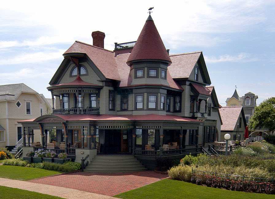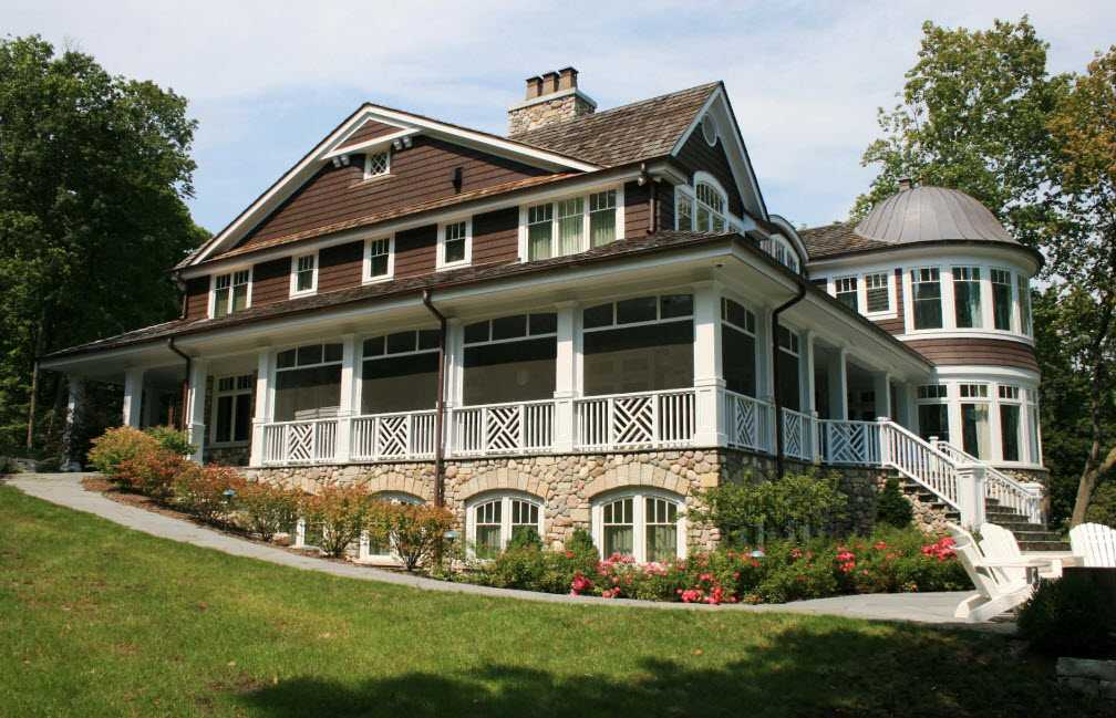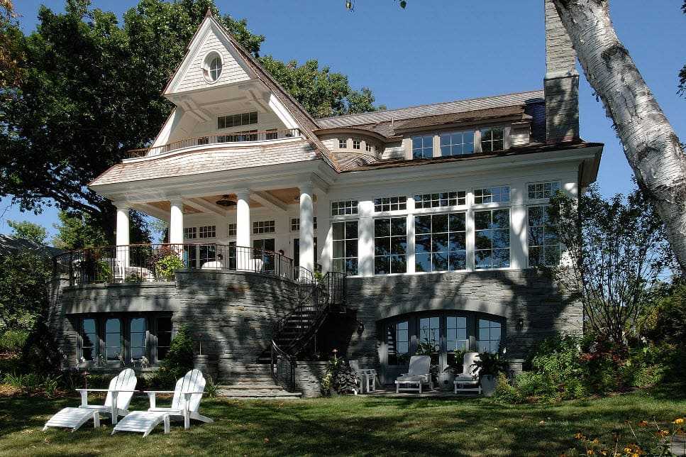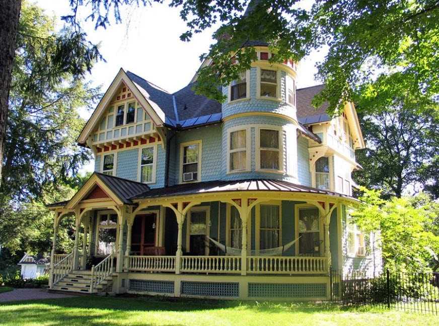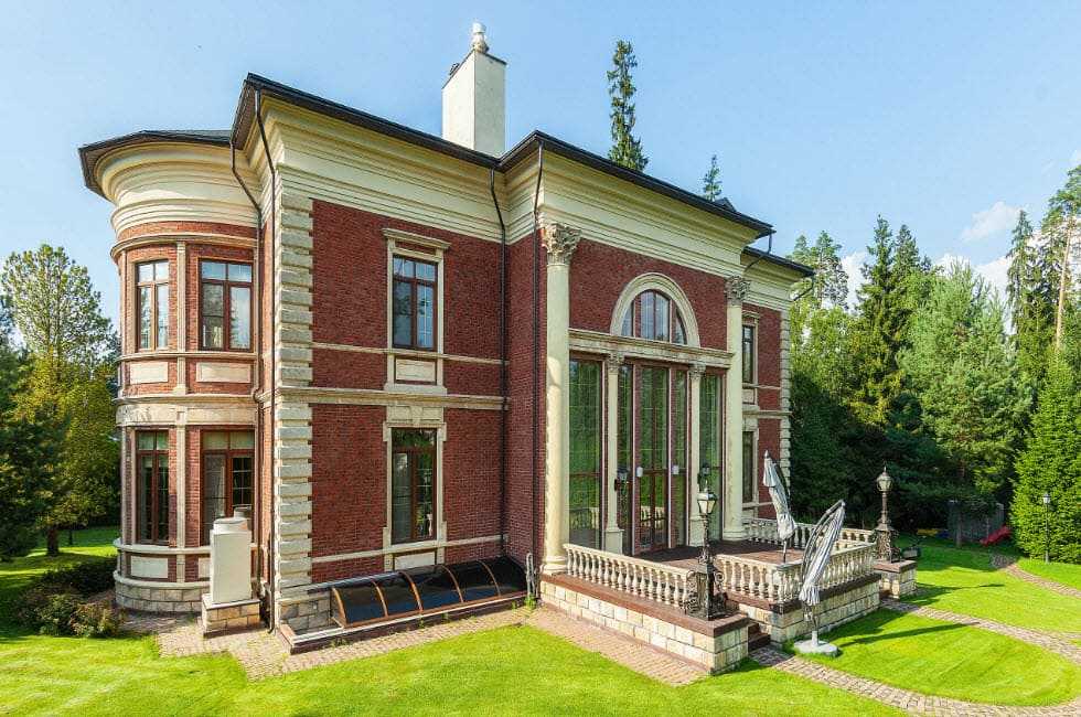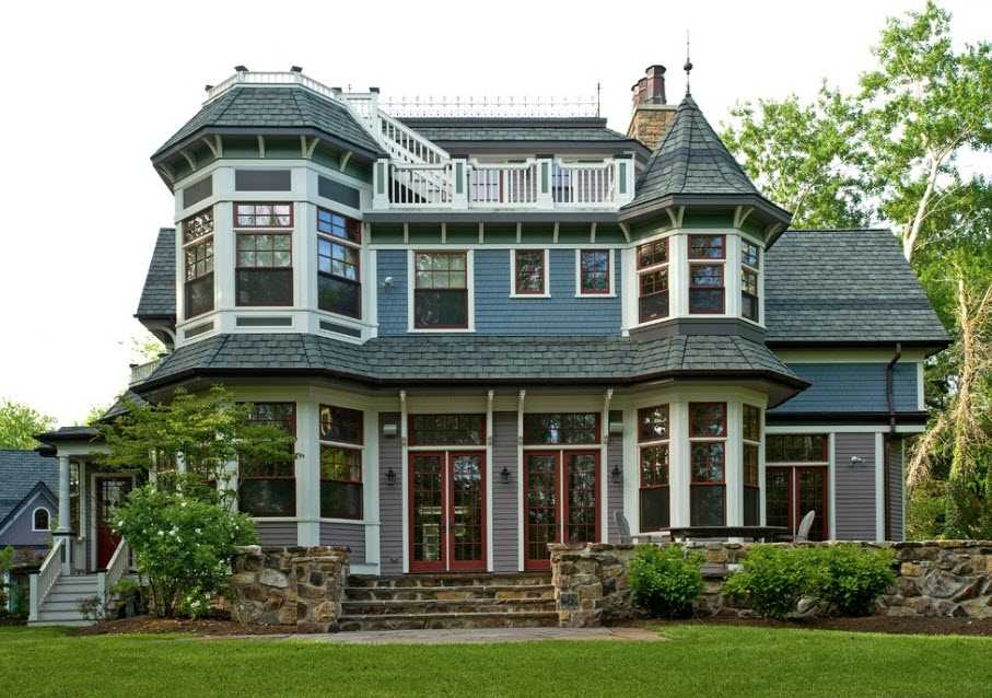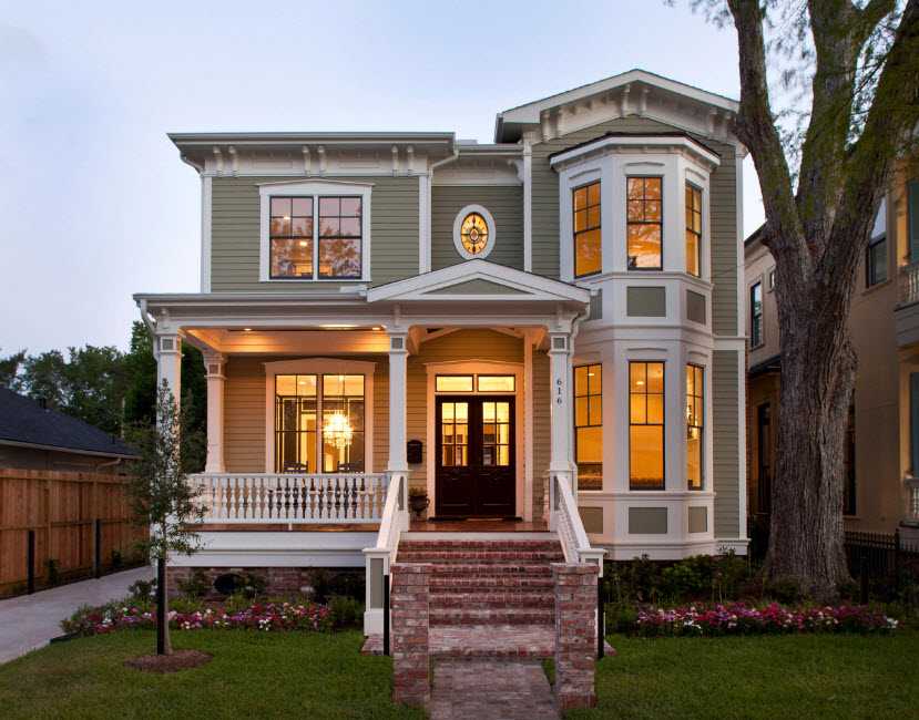 Конструкция. Обычно дом имеет несколько этажей, высокий цоколь и просторную террасу. Что касается окон, то обычно это прямоугольные или арочные конструкции.
