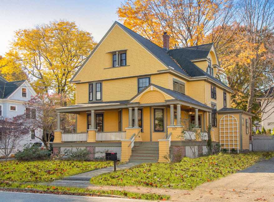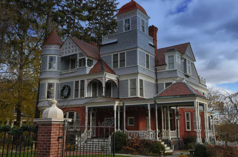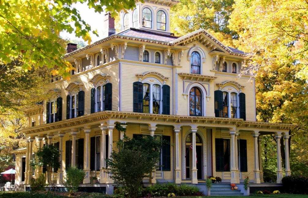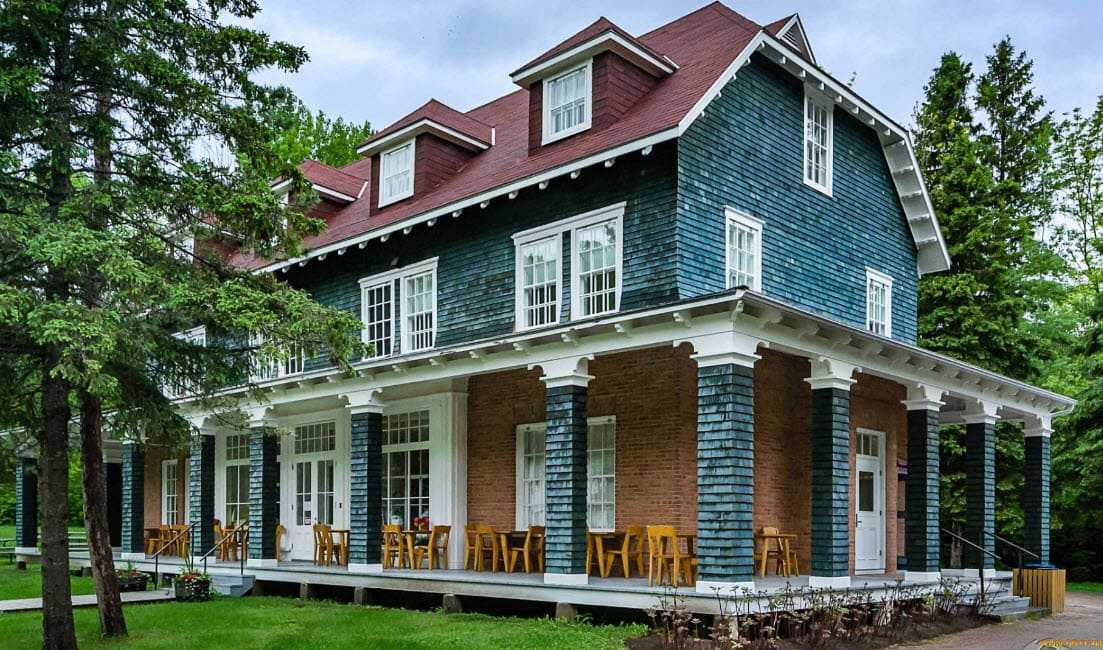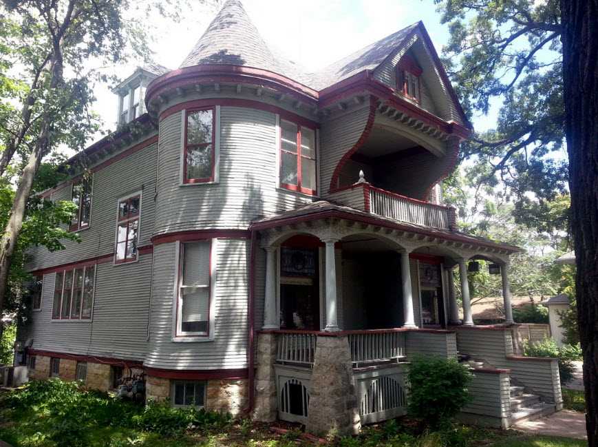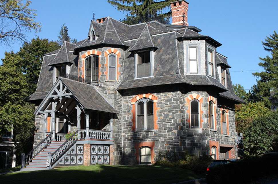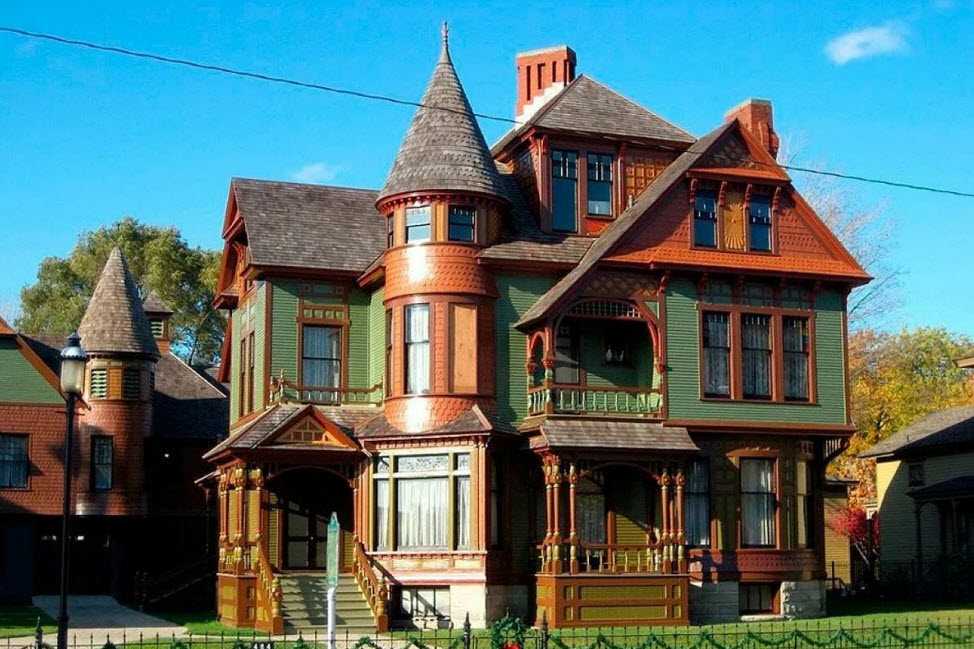 Конструкция. Обычно дом имеет несколько этажей, высокий цоколь и просторную террасу. Что касается окон, то обычно это прямоугольные или арочные конструкции.