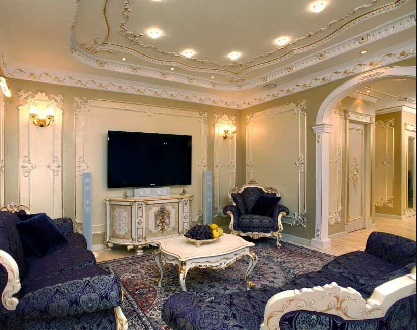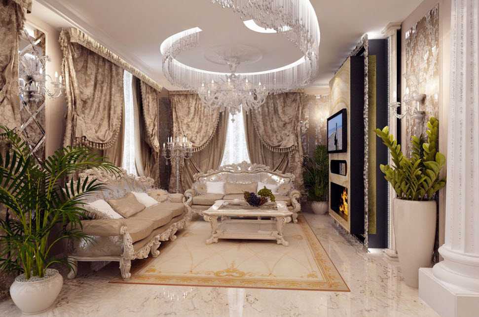 Главный элемент гостиной – камин (желательно настоящий), украшенный лепниной и мраморной отделкой. Живой огонь не только дарит тепло, но и создает красивую картинку, внося в интерьер чувство уюта и комфорта. Стоит отметить, что грамотно оформить внутреннее пространство своими силами не получится, лучше пригласить дизайнера, способного соблюдать пропорции. Жилье не должно быть наляпистым, но и брак в декоре сделает его пустым, незавершенным.
