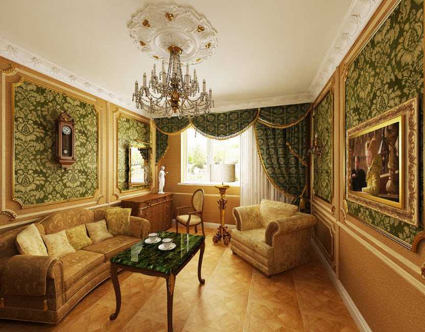 - Оформление стен гобеленами в оригинальных позолоченных рамках, резными панелями.