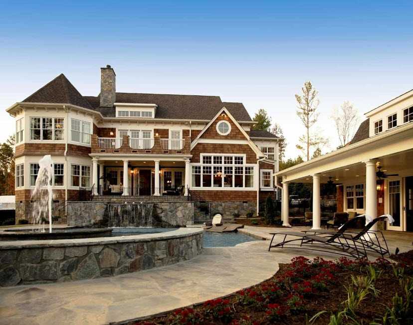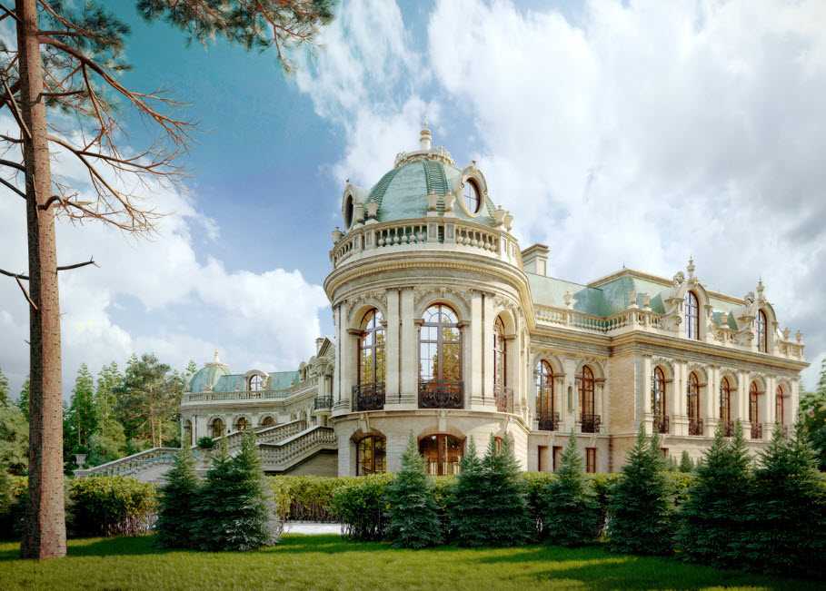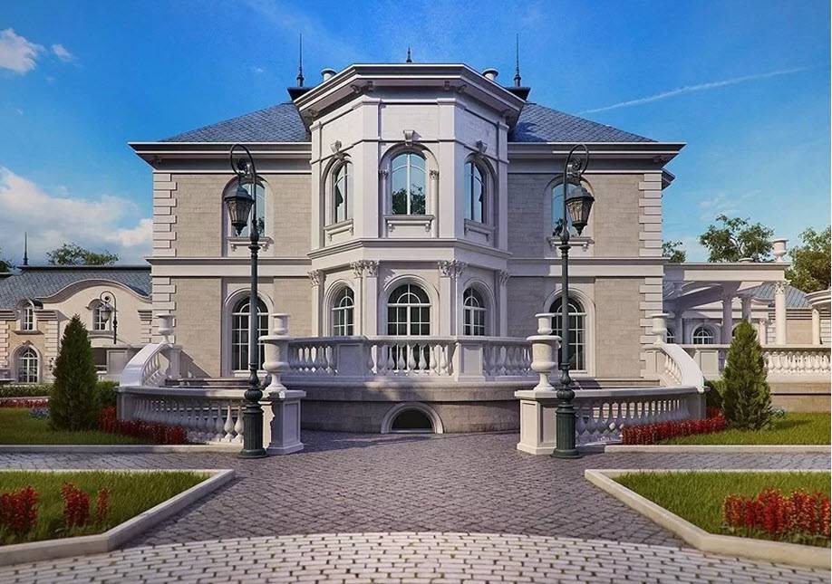 Подобный дом станет прекрасным решением для состоятельных заказчиков, проживающих в элитных районах. Подобный проект не только имеет привлекательный внешний вид, но и окружает домовладельца роскошью, демонстрирует и подчеркивает его статус. Этот стиль служит прекрасным полем для фантазий и их воплощения, но стоит помнить, что за все идеи придется платить и не мало, ведь здесь нет места для простого и дешевого декора или материалов.